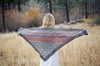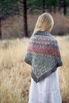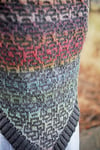 Notes: The main body of the shawl is worked first starting at the bottom point and finishing with the top edge. It is worked in a stockinette mosaic pattern using one color of yarn every two rows. Stitches are then picked up along both sides and the side edging is worked in k2, p2 rib