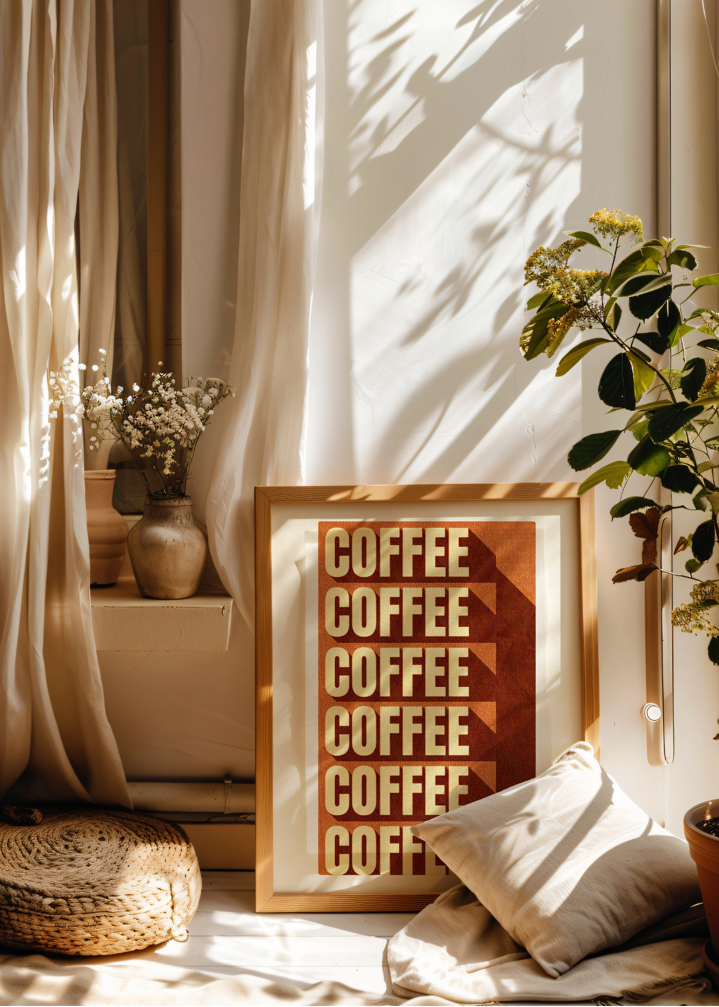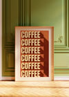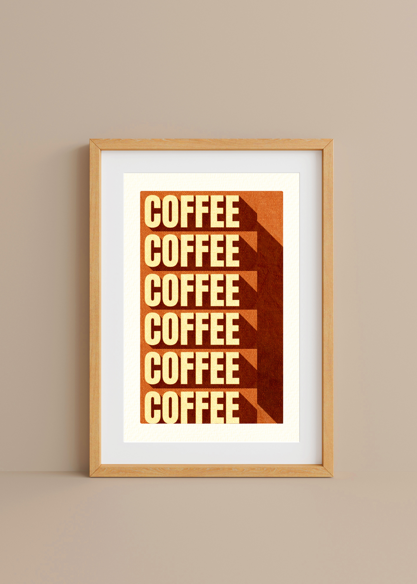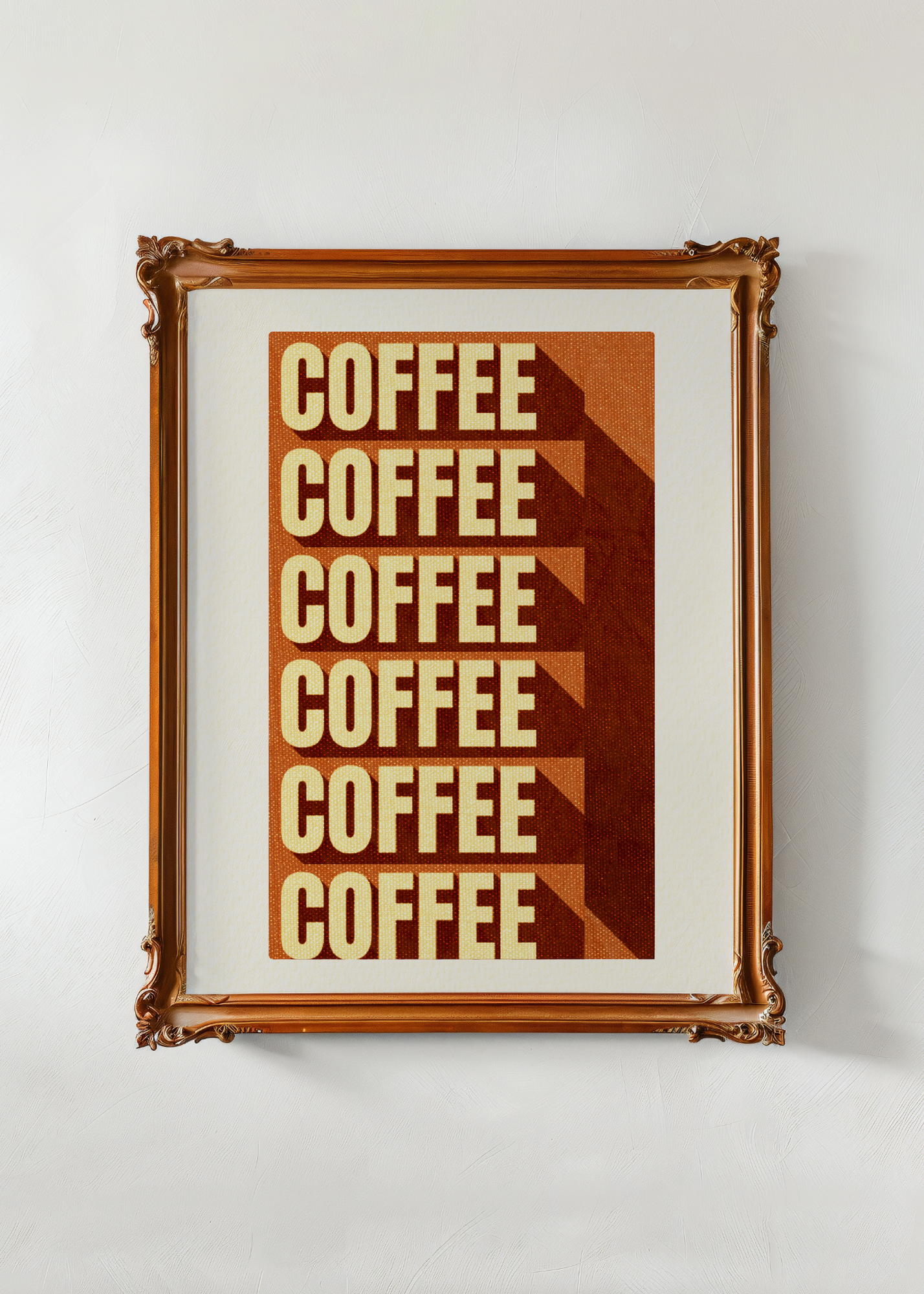 Coffee Coffee— Creamy whites and layered browns bring this cozy print to life, framed in white and stacked with the word “coffee," with bold cream letters and deep brown shadowing for that vintage café aesthetic. It's warm, grounding, and perfect for anyone who finds comfort in a morning ritual—or who’s on their third cup by noon.