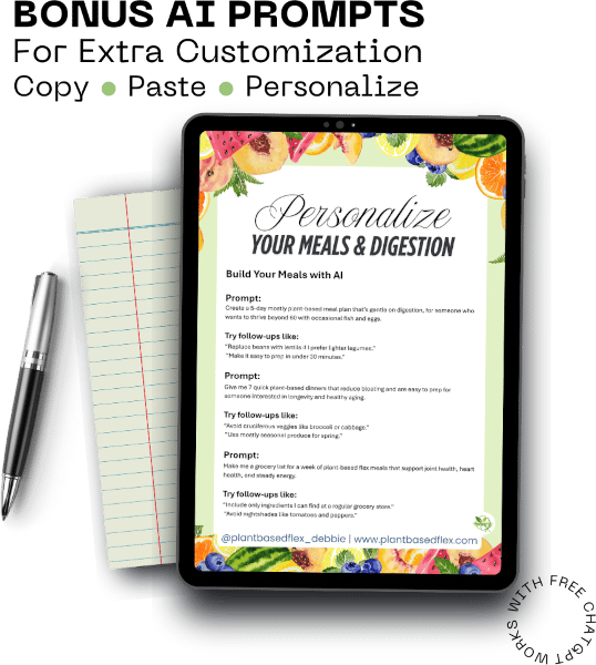 - Bonus AI Prompts (PDF): ready-to-use prompts + follow-ups to customize meals & digestion (copy → paste → personalize).