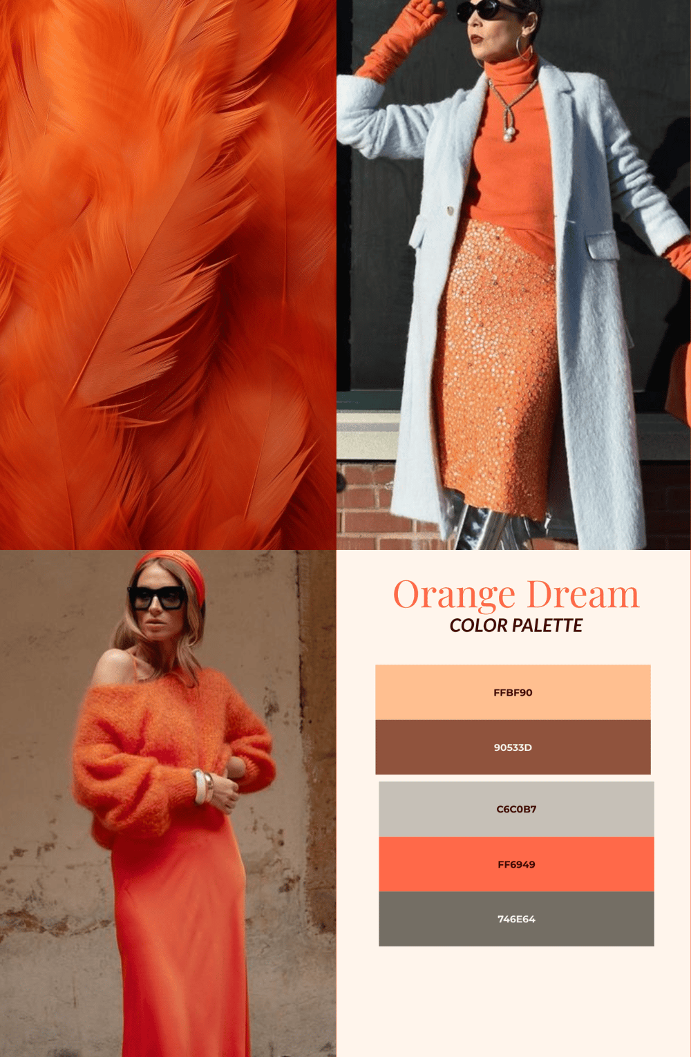 Orange Dream is ideal for statement outfits, seasonal wardrobes, and bold yet sophisticated styling. Use it to create monochrome looks, color-blocked outfits, or grounded neutrals with a pop of warmth. These tones flatter a wide range of skin tones and feel especially powerful for confident, expressive dressing.