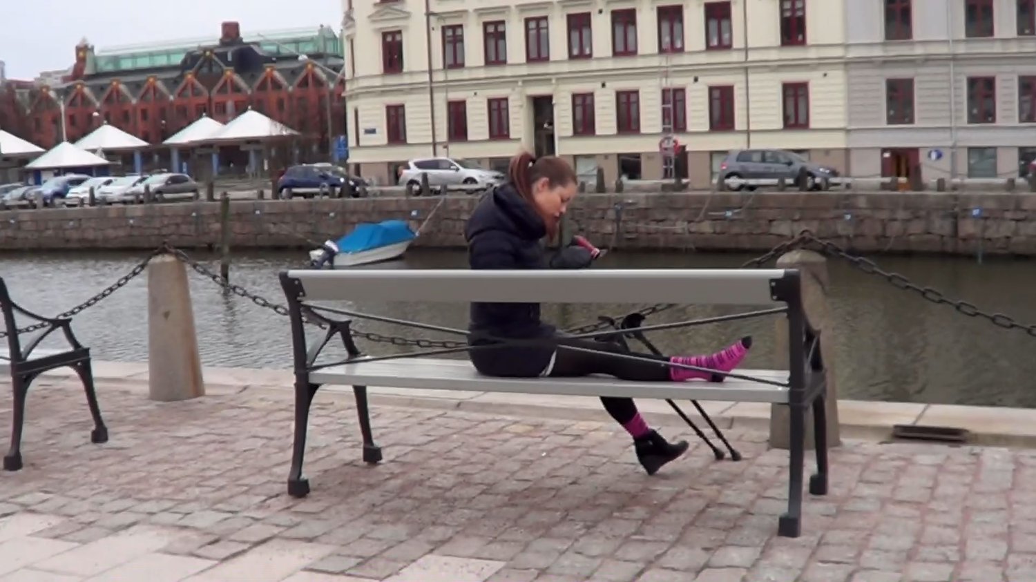 We catch up with Melinda when she sits on a bench filming her hurt foot for us.She start to crutch along the water and we get som great crutching shoot before Melinda sits down on another bench and starts to massage the pink sock she has over her hurt foot.The foot start to get cold so she turn around and walk on her tip of her toes back to the car.This make her ankle to hurt so she put the foot up on the crutch for another rest.