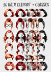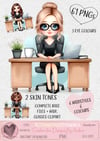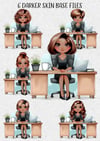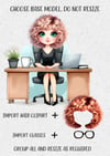 Office girl. 18 paler skin base files, all with blonde hair as standard and a choice of blue, green, brown eyes. 6 Darker skinned dolls base files all have brunette hair and brown eyes. 36 hair clipart files; 6 styles in 6 colours plus glasses.