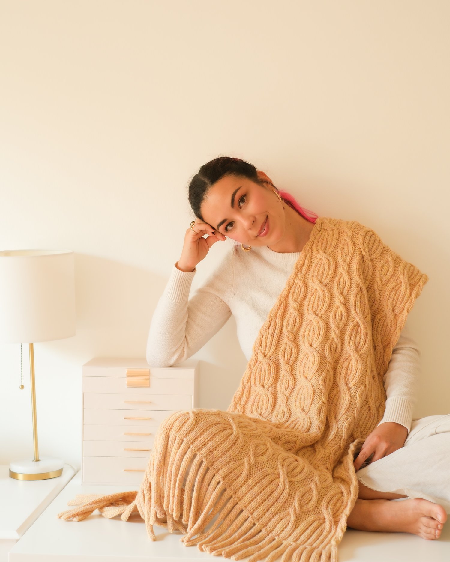 - The piece can be finished with a wide ribbing or double knit fringe (or both!)