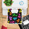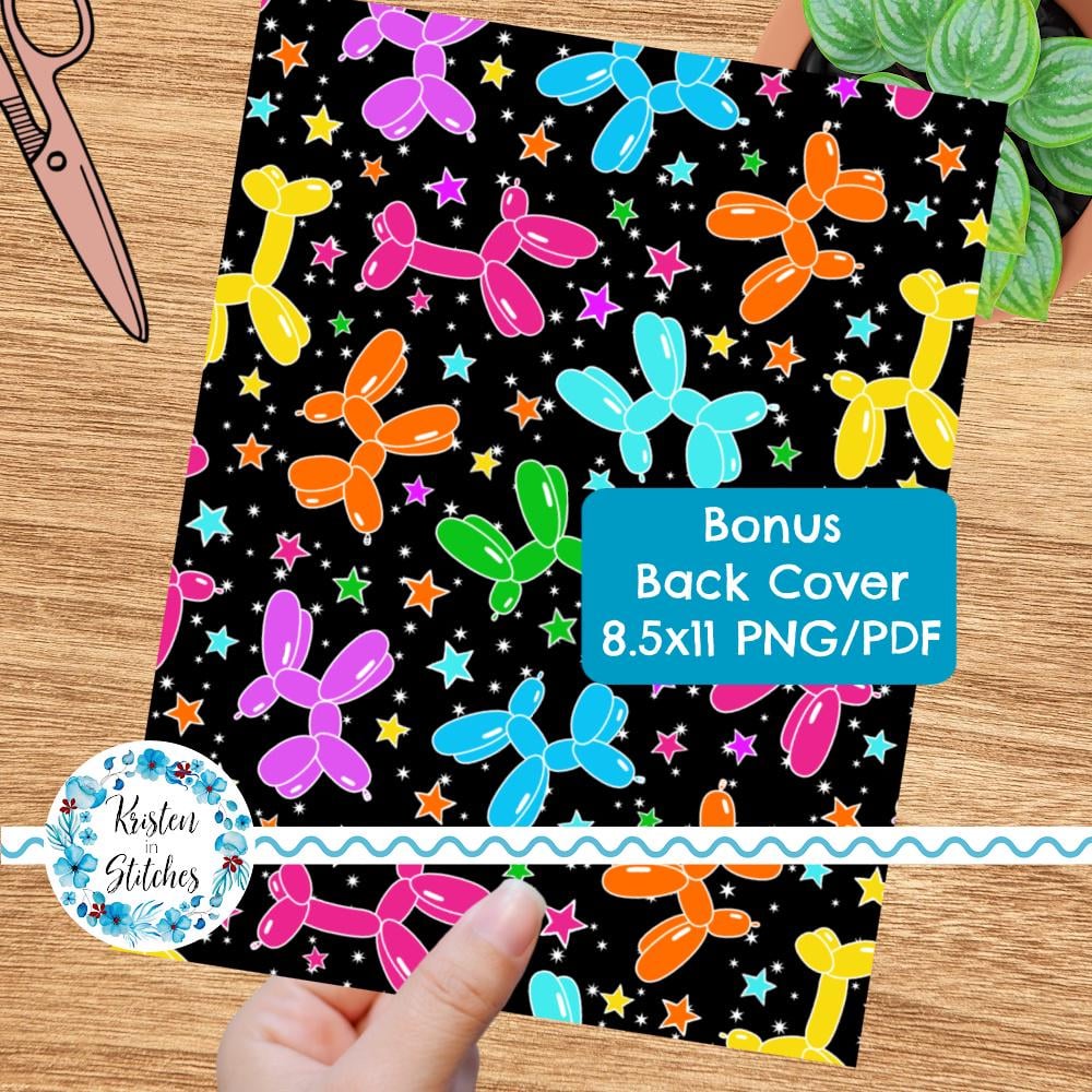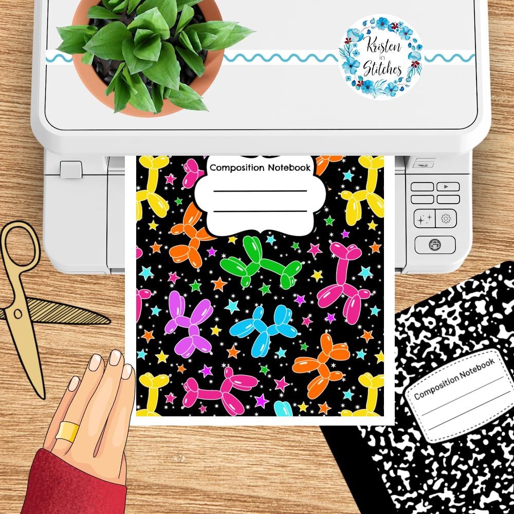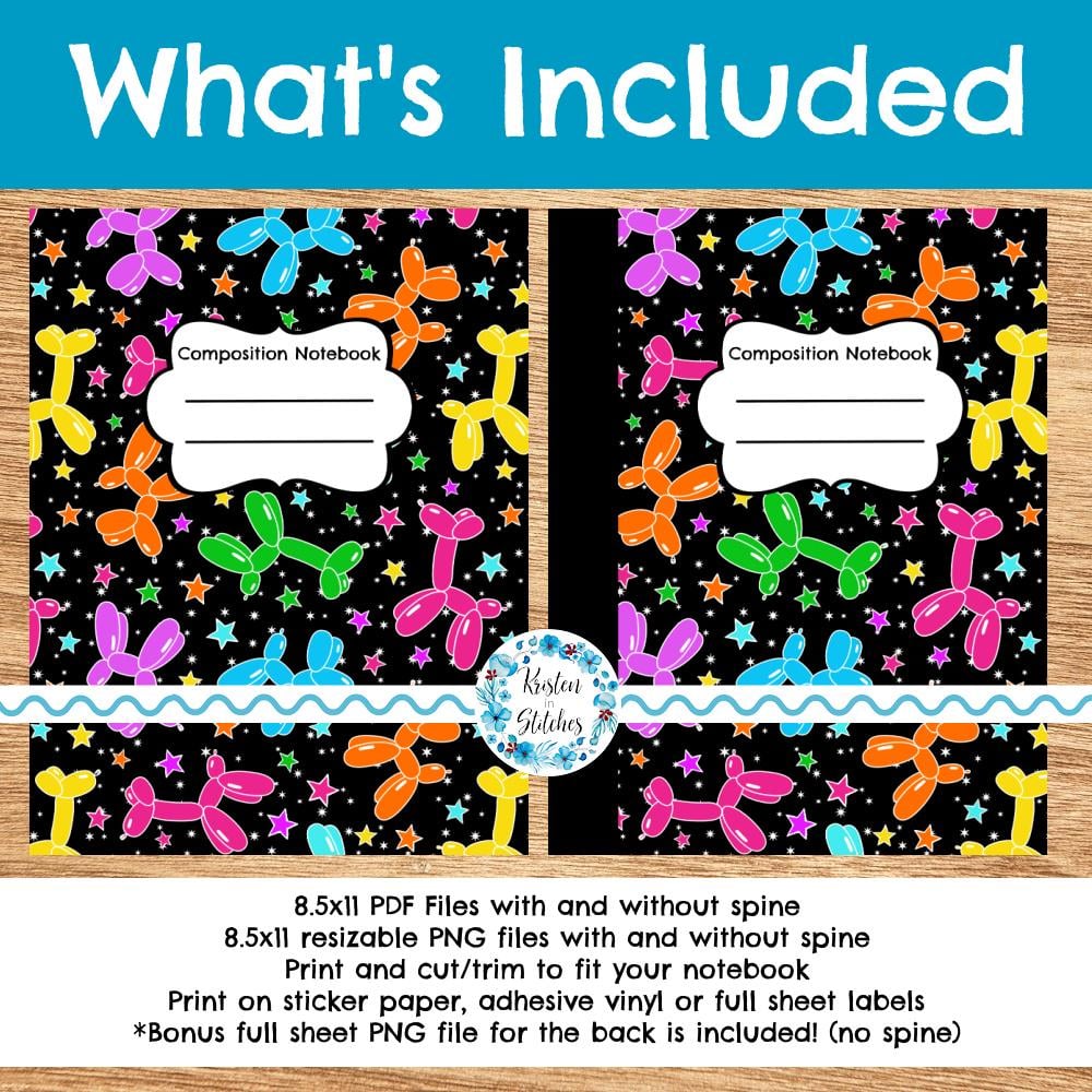 Composition Notebook Cover, Printable Resizable PNG, PDF, Neon Rainbow Party Pups Balloon Dogs