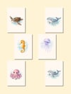 Bring the ocean into your nursery with this set of 6 baby ocean animal watercolor prints.
