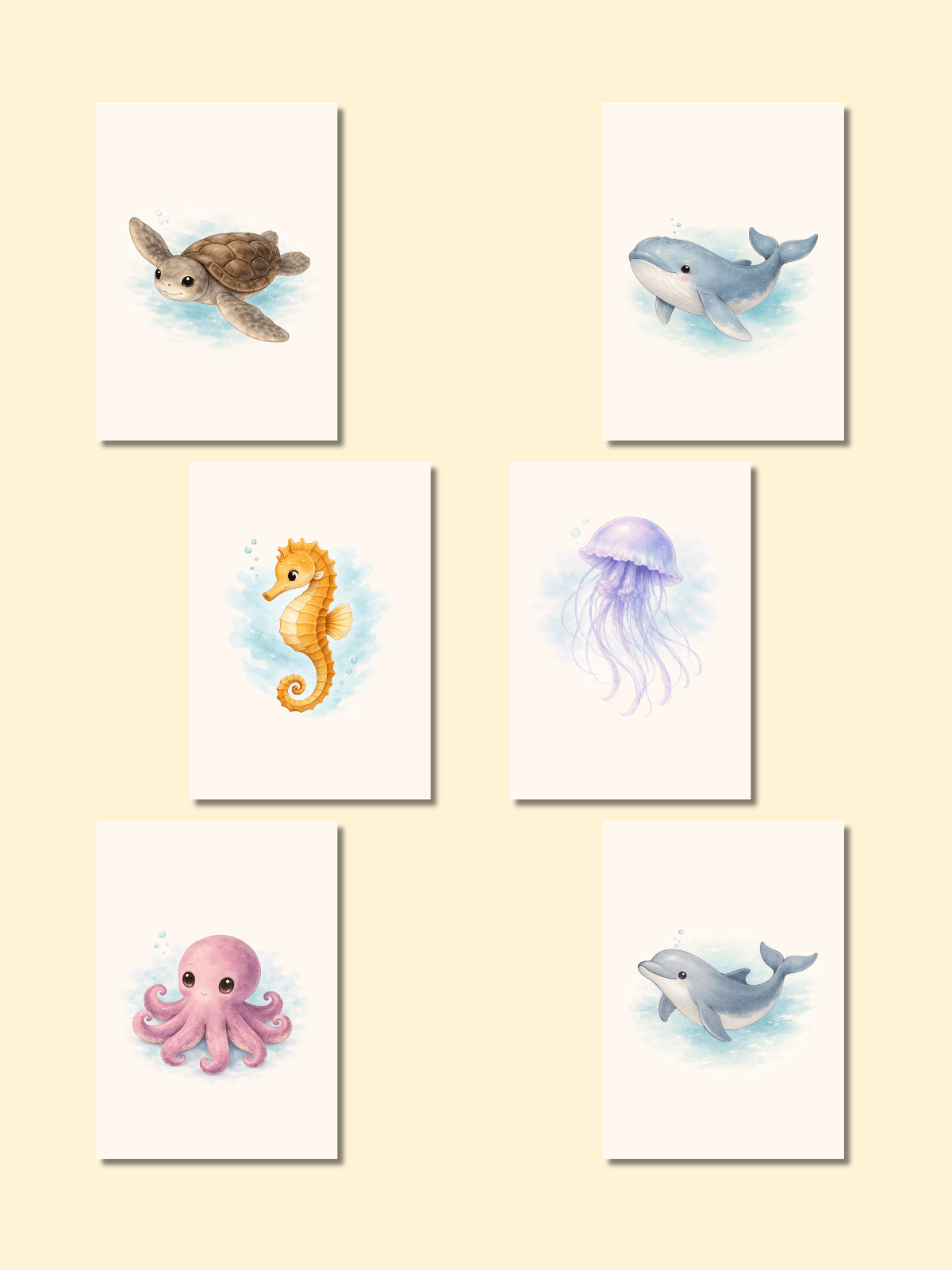 → 6 baby animal illustrations: Whale, Dolphin, Sea Turtle, Seahorse, Octopus, Jellyfish