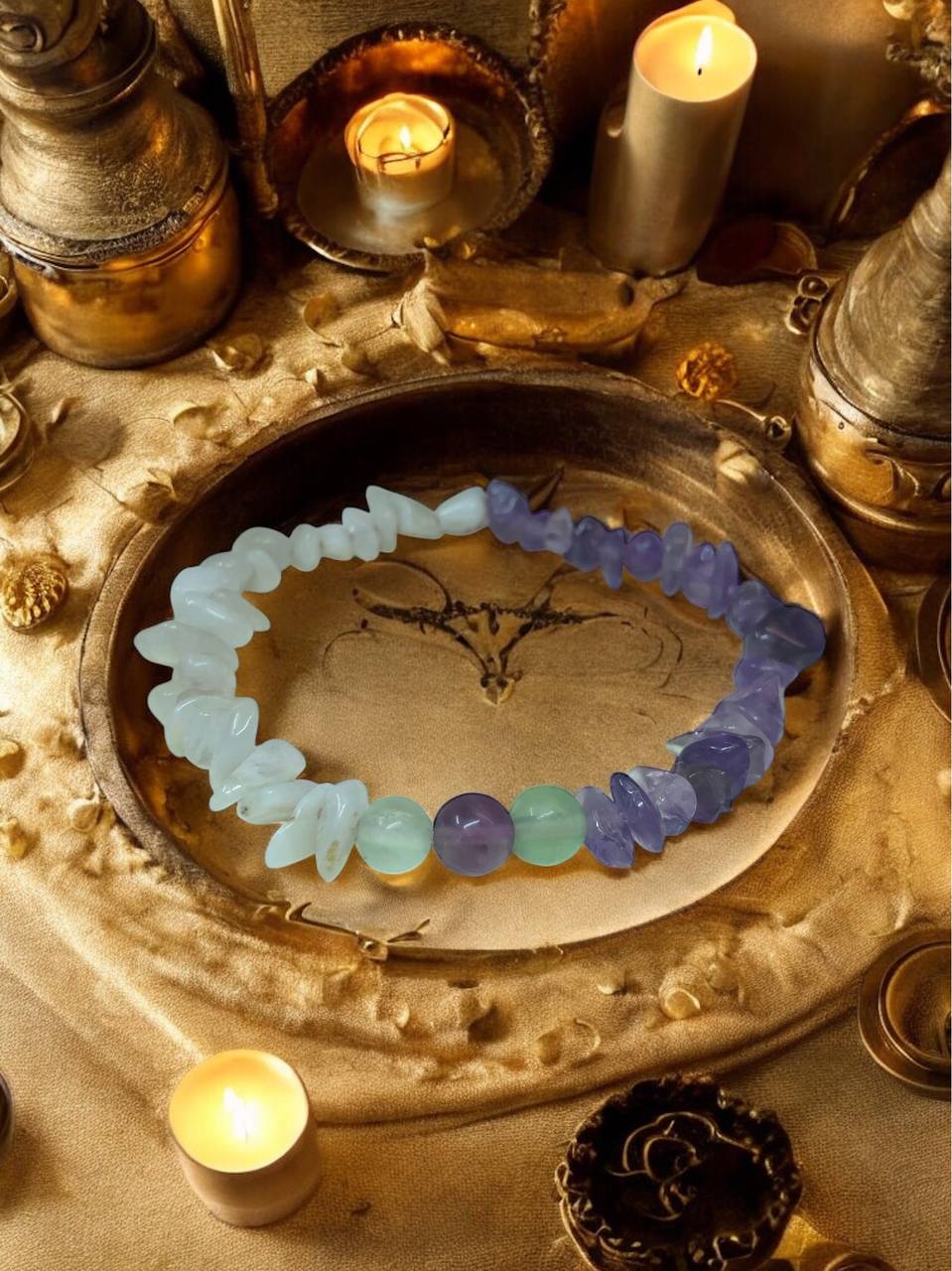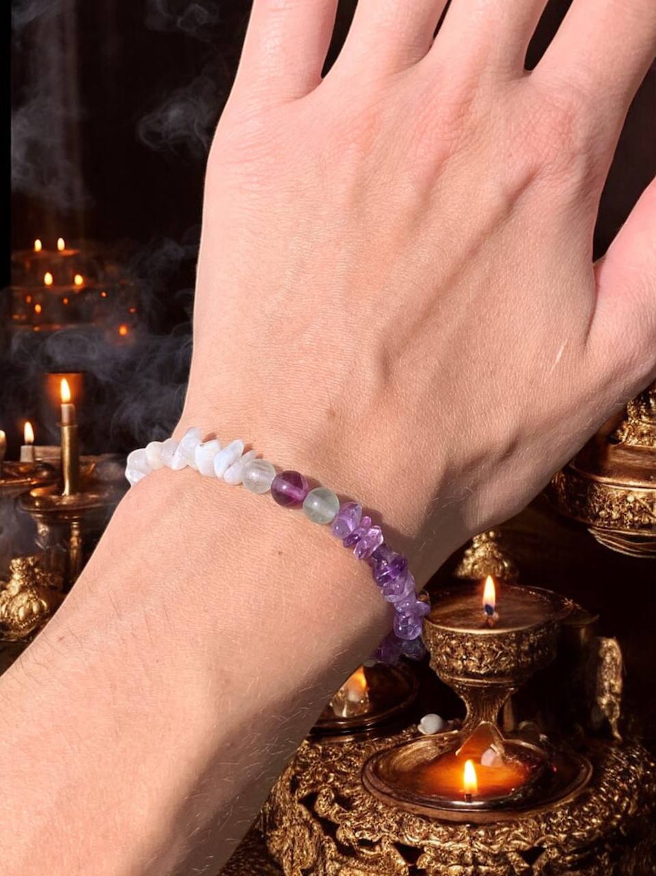 Bracciale “Figlia della Luna” – Ametista, Pietra di Luna e Fluorite (6 mm)