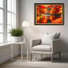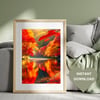 Nature Landscape Autumn Riverbank Lines with Trees in Autumn Colors, Deep Red, Bright Oranges, and Golden Yellow Leaves Reflection in the Calm, Clear Water. Beautiful River Landscape Wall Art Nature Print. Wall Décor.