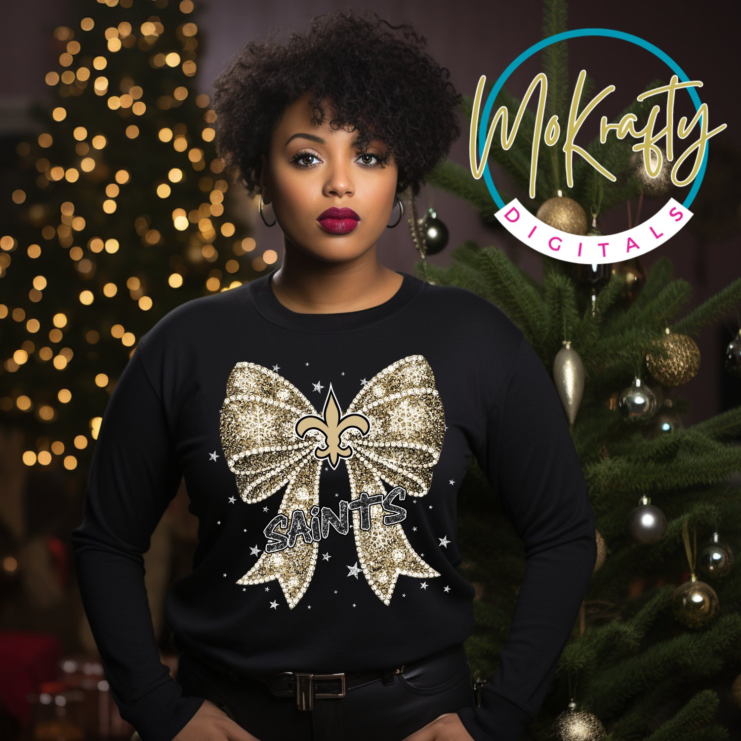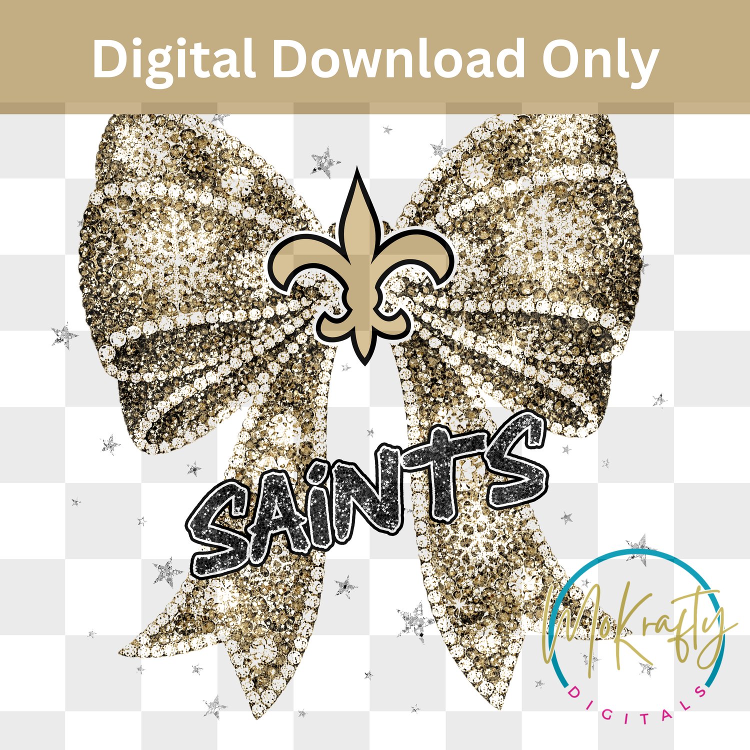 Bring full glam energy to game day with this sparkly rhinestone bow design featuring the Saints colors and mascot. Perfect for shirts, tumblers, hoodies, stickers, fans, and custom game-day merch.