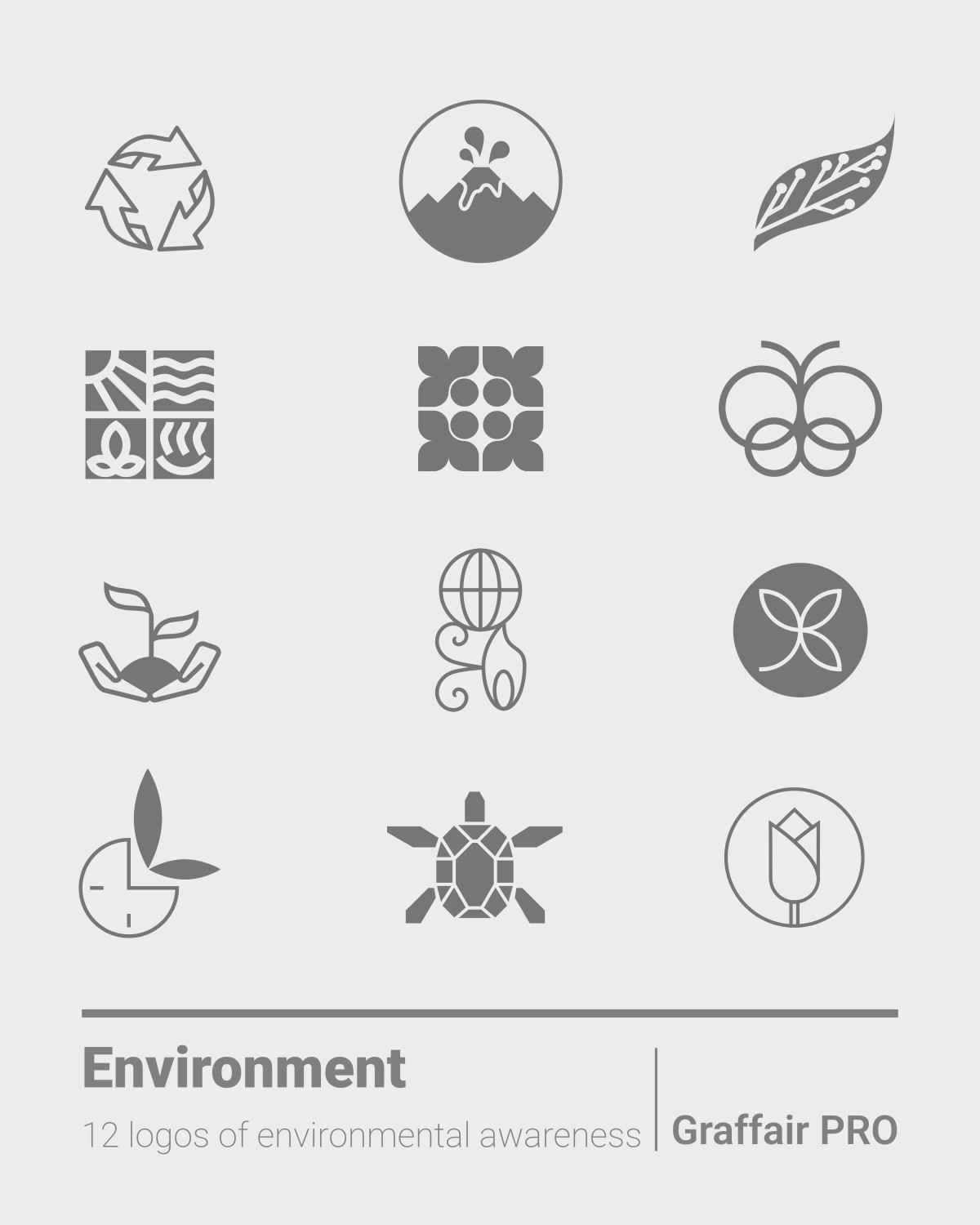 Environment: A set of 12 (twelve) monochrome logo designs raising environmental awareness.