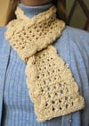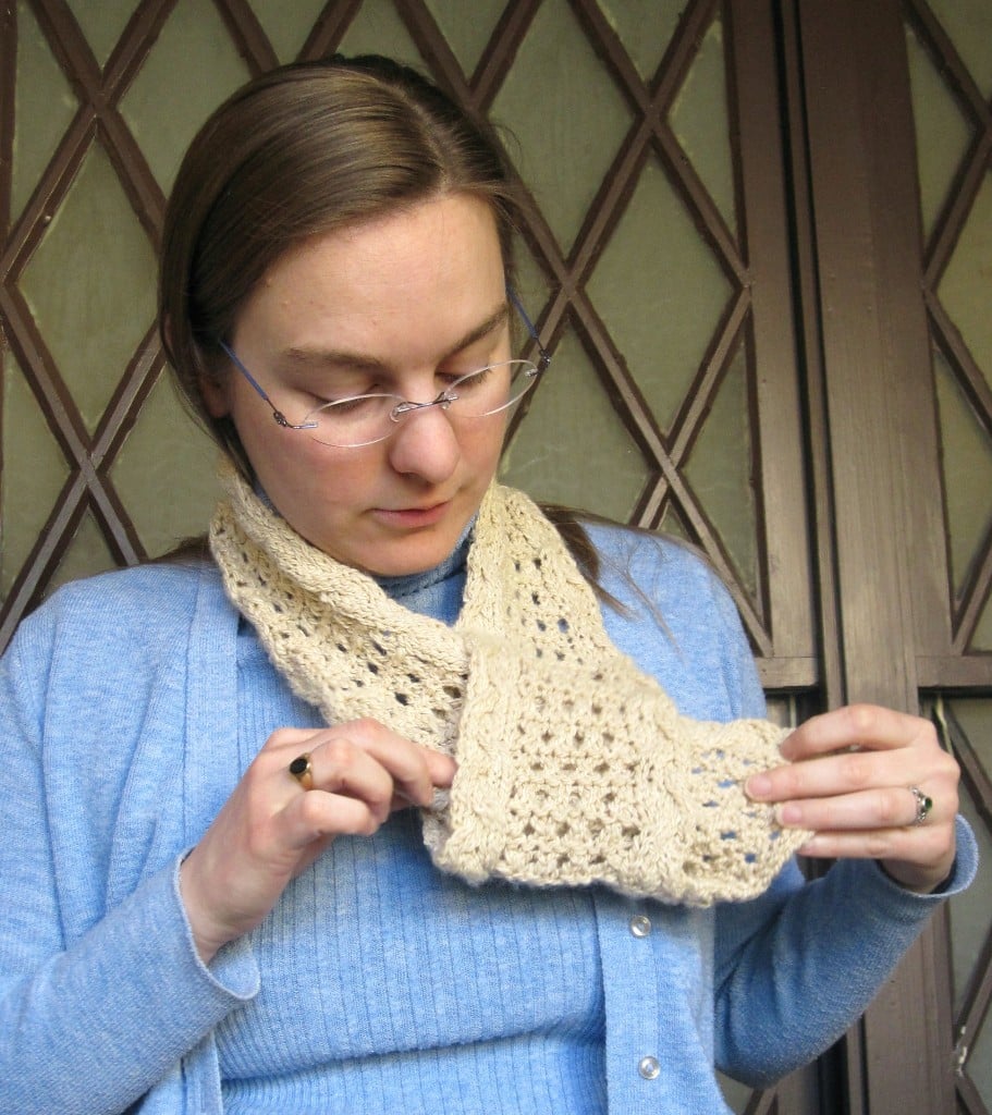 This scarflette is easily fastened at the neck by tucking the cast off end through a pocket formed at the beginning. As a result, you can use a smaller amount of luxurious fiber to get a warm and snuggly scarf - just one skein of worsted weight yarn will do fine.