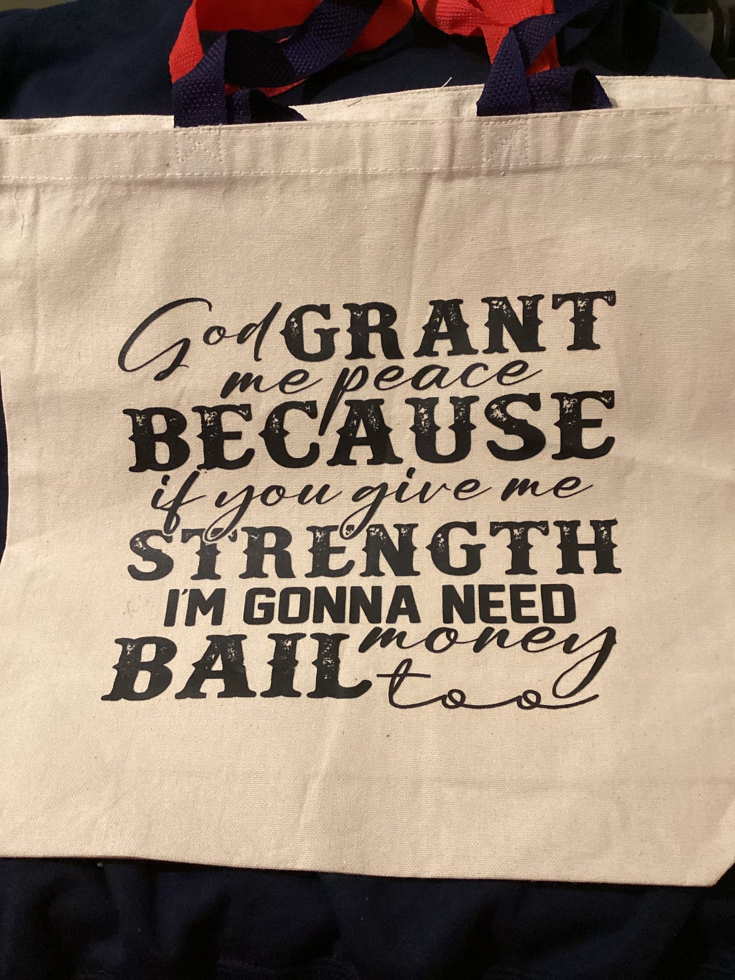 Screen print tote bag with blue handles.
