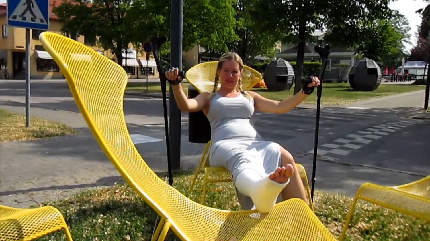 Sanne is pregnant and should take it easy but has managed to break her foot and now has a white SLC.She crutches to one of the town square where there are a lot of chairs to rest on.Sanne sits on one of them and lays up her cast on another.She wiggling her toes for us when we take a closer look at her SLC.After the break she crutch to another square where she stops at a market vendor selling flowers before continuing back to the car.