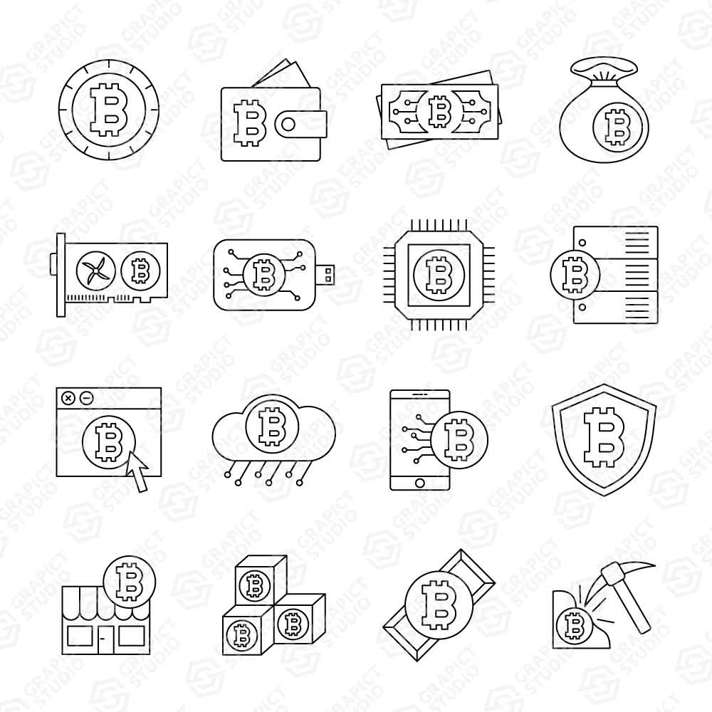 Bitcoin crypto currency mining, outlined icon editable stroke