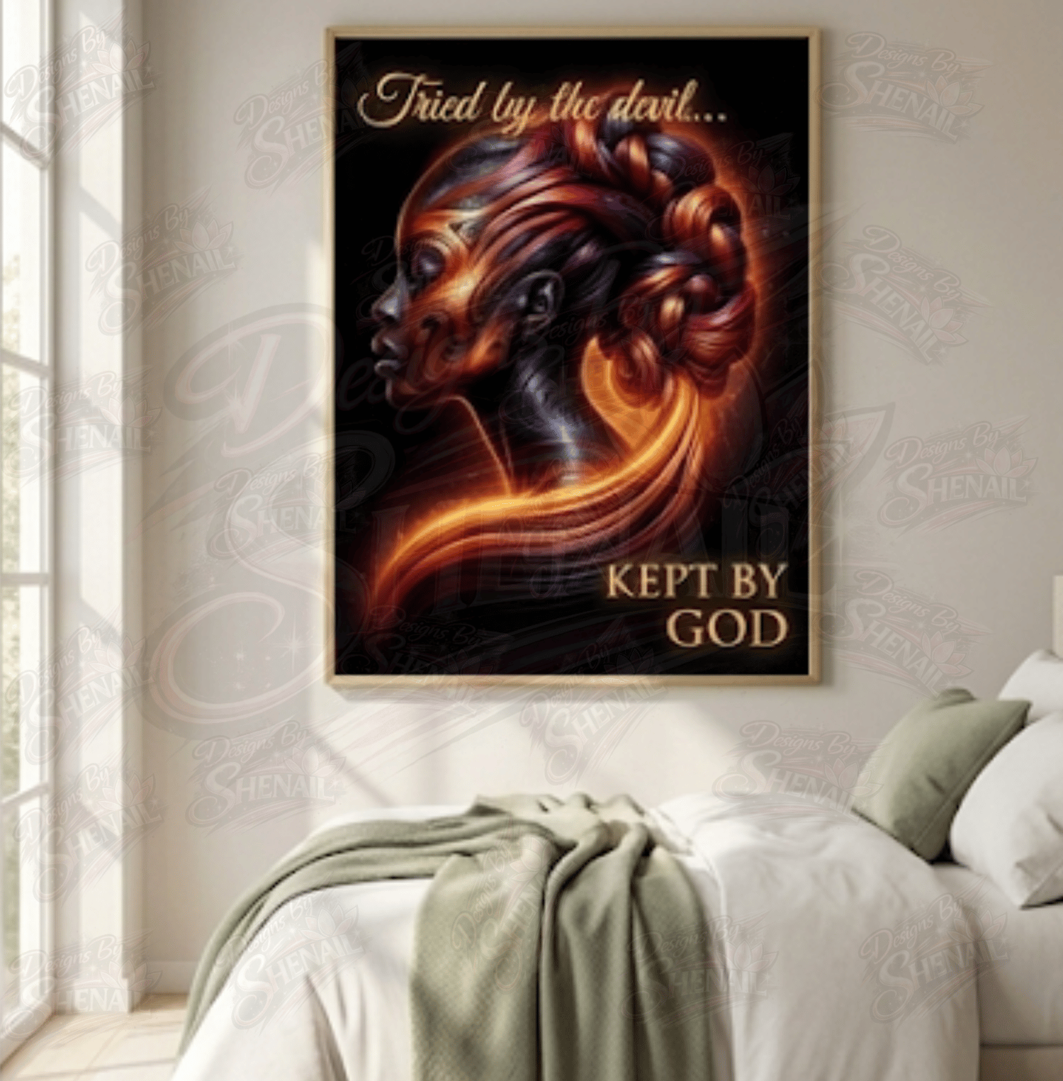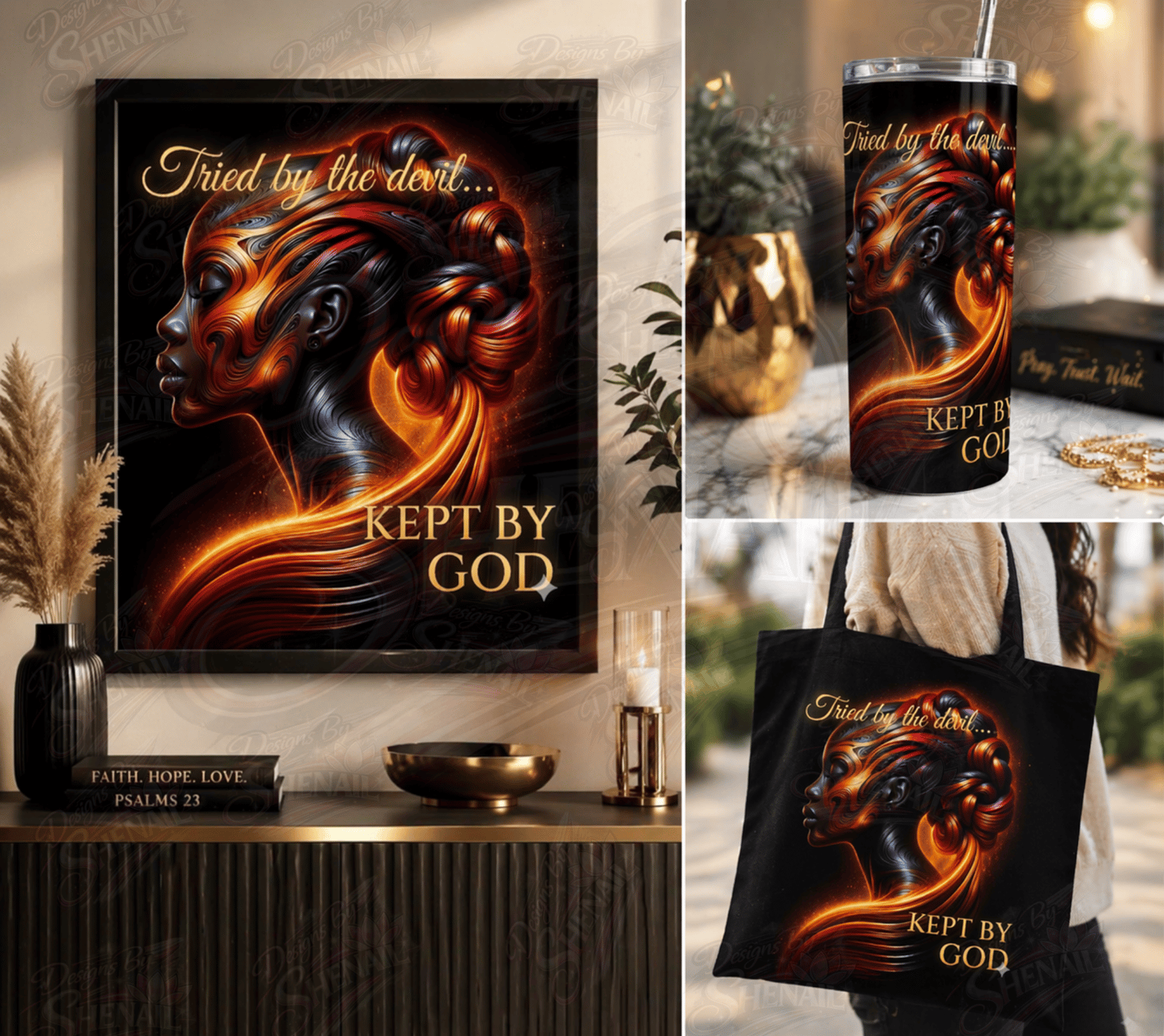 This powerful “Tried by the Devil… Kept by God” design is a bold declaration of resilience, faith, and divine protection. Featuring a stunning, radiant Black woman with flowing, fire-like hair and glowing tones, this artwork embodies strength, grace, and spiritual endurance.
