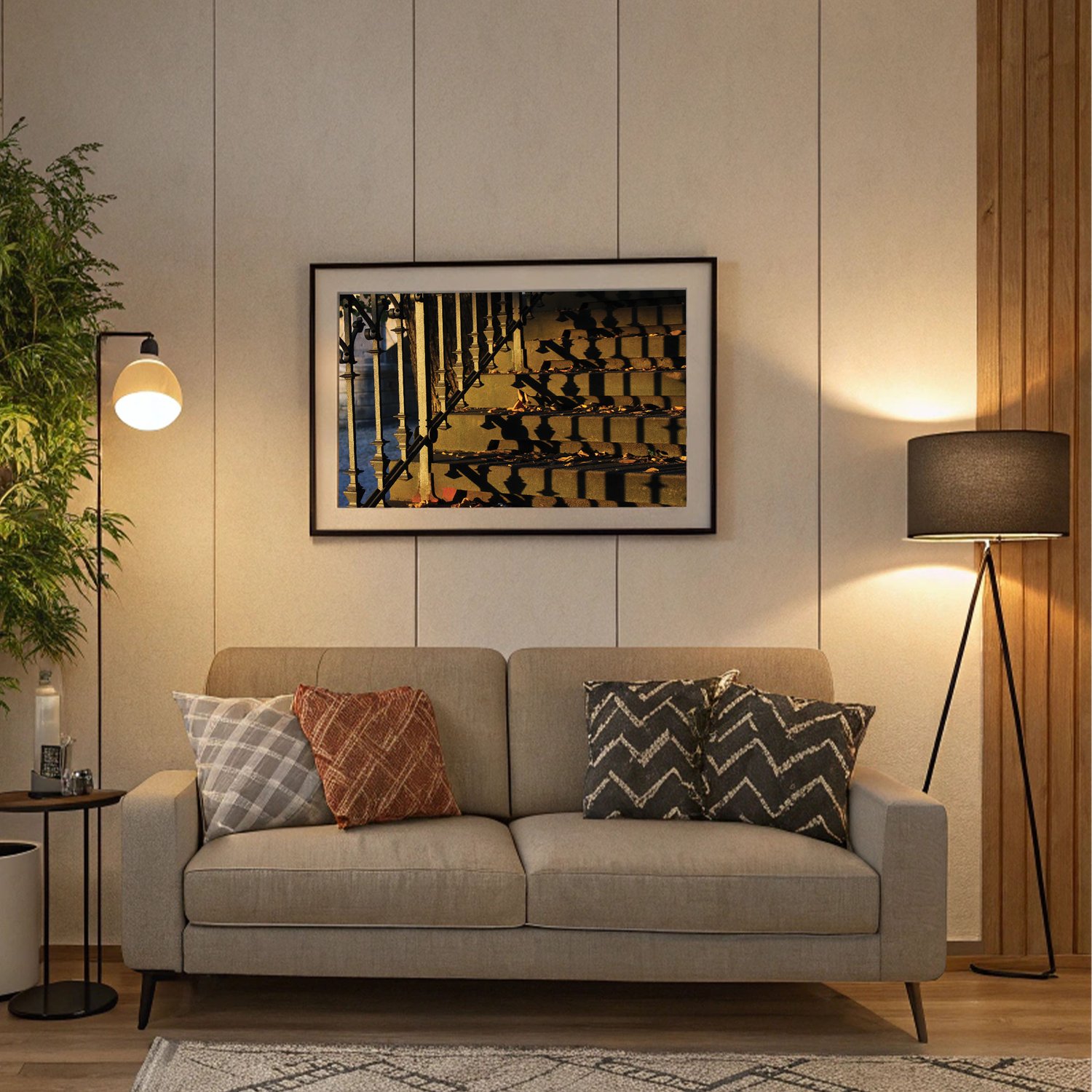 Photo of the European Steps in Drede with a partial view of the Elbe. A late summer and early autumn atmosphere in Central Europe. The late evening sun softens this urban composition, perfect for a cozy, soft, and warm decor.