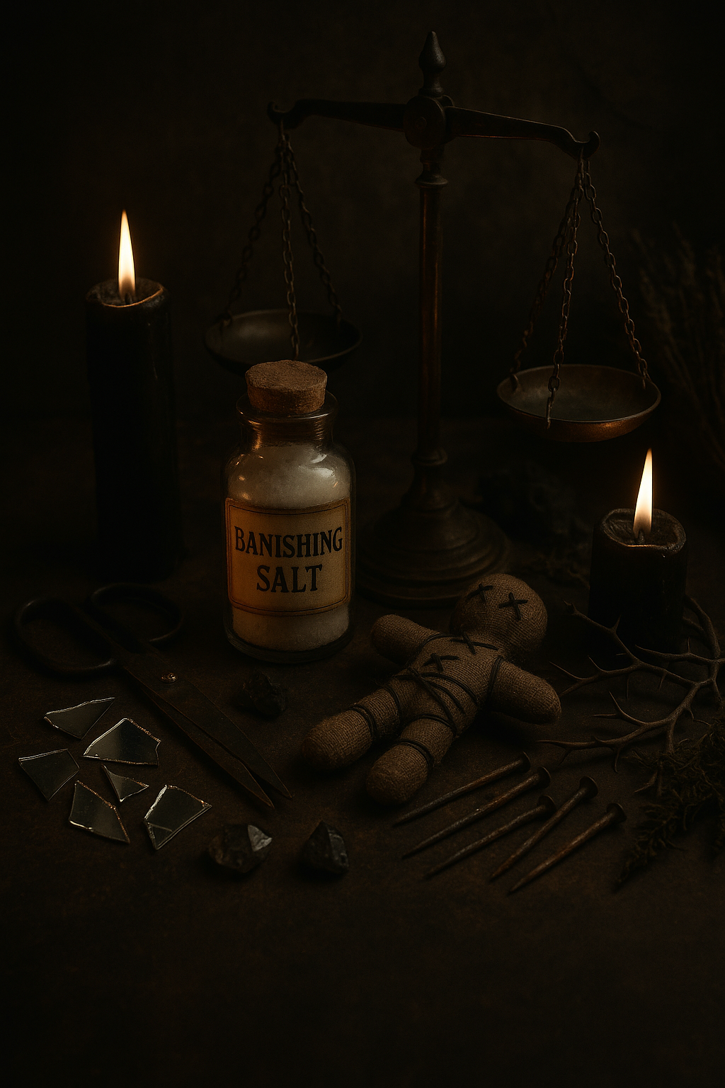 This ritual pairing combines Banishing with a Hex for Justice, giving you both removal and repercussion.