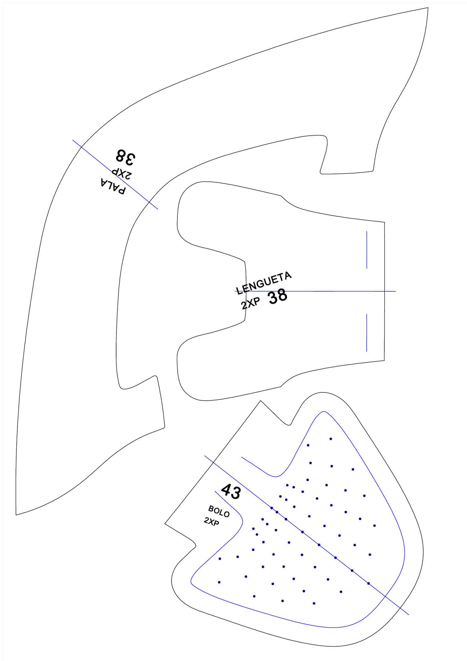 patrón de zapatilla urbana en hoja A4 PDF talla escaladas del 38 al 43. listo para imprimir y hacer tu propia producción.