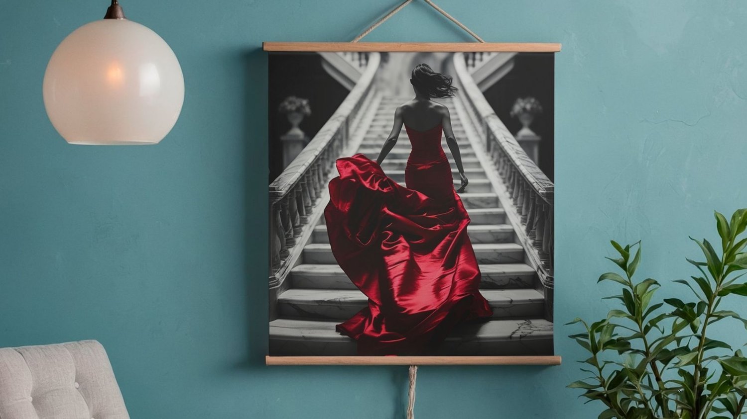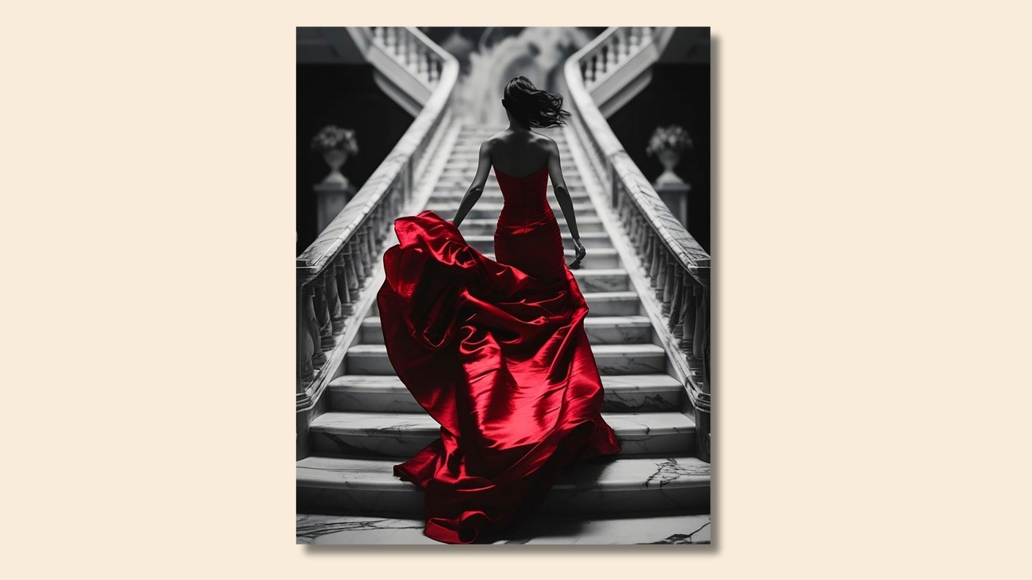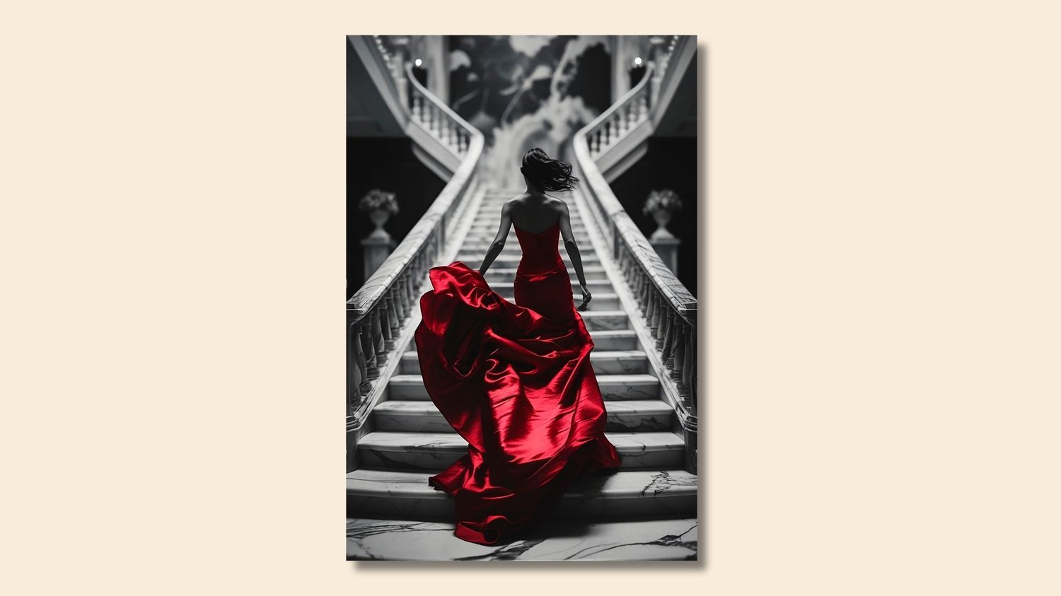 Dramatic black and white fashion wall art featuring a woman running on a staircase in a flowing red evening dress. Cinematic motion, strong contrast, and luxury noir aesthetic make this piece ideal for modern interiors. High-end fine art printable digital download for elegant home or studio décor.