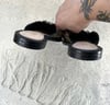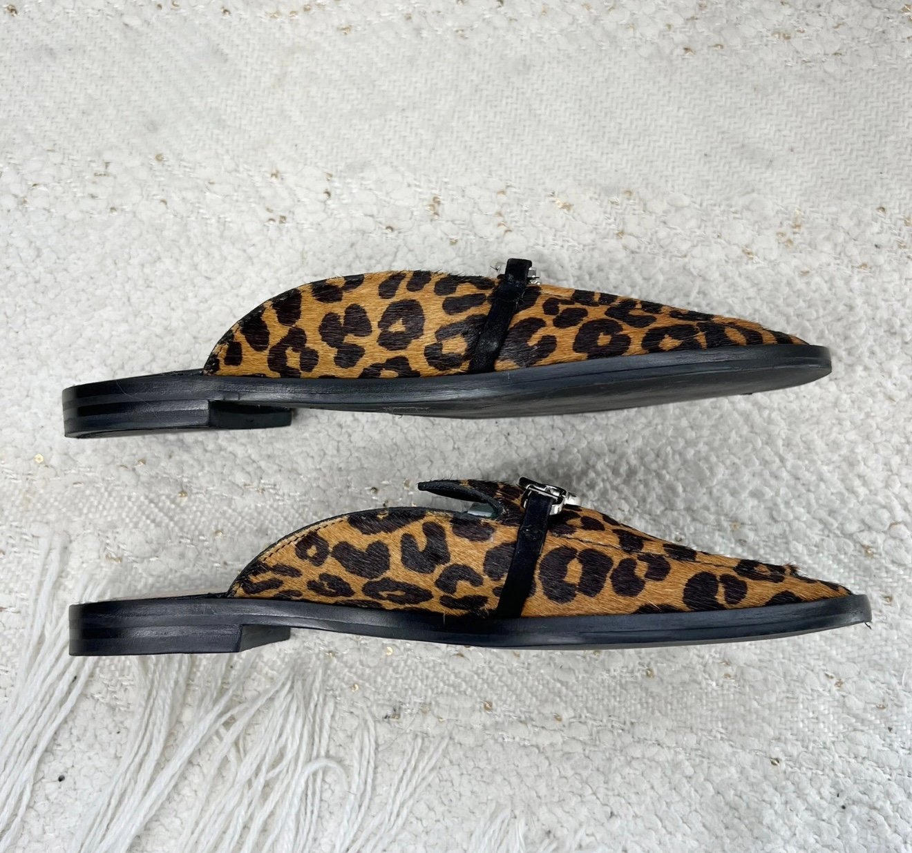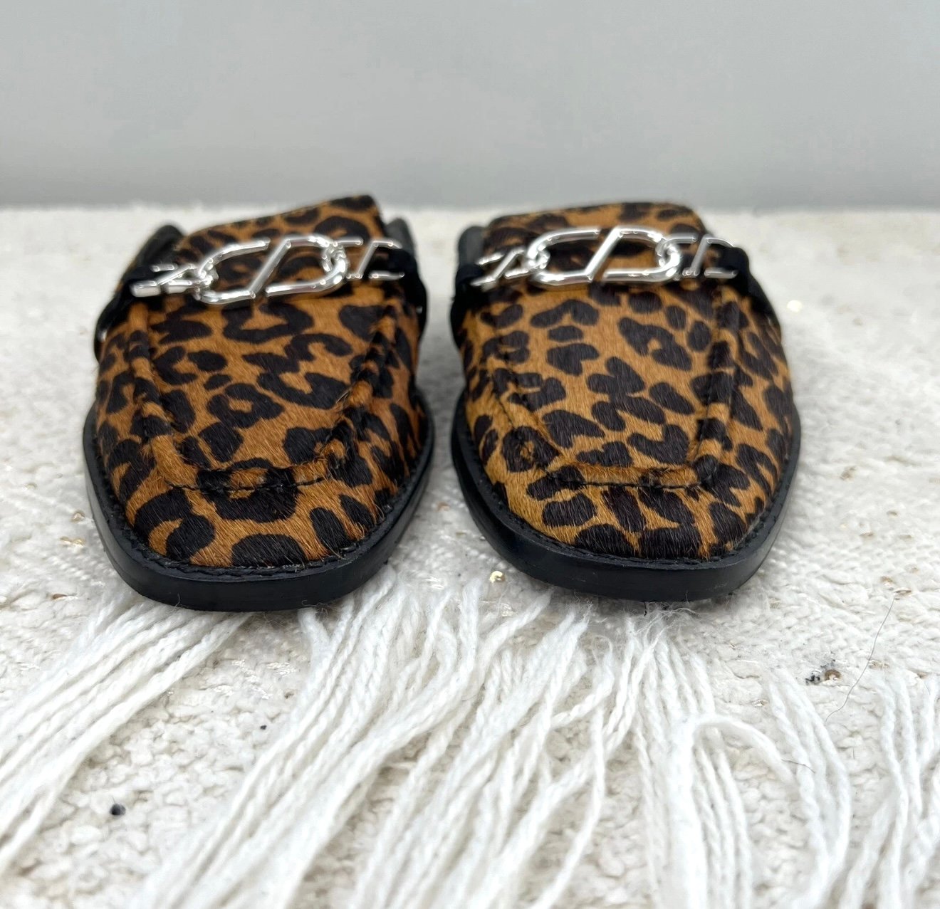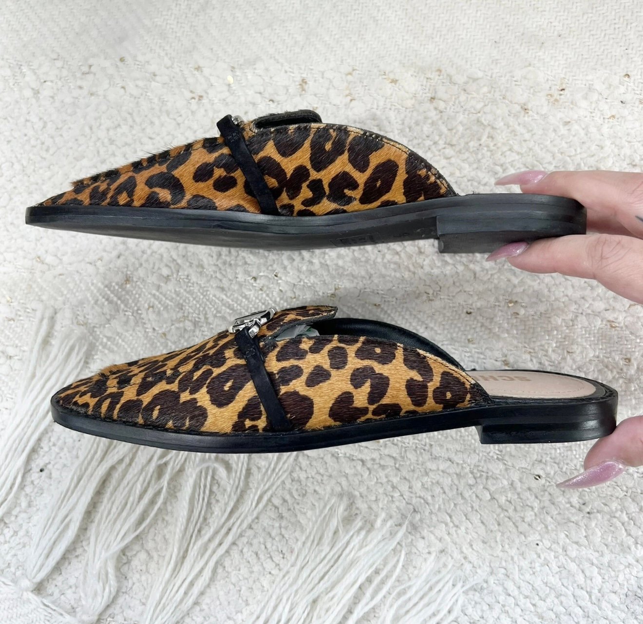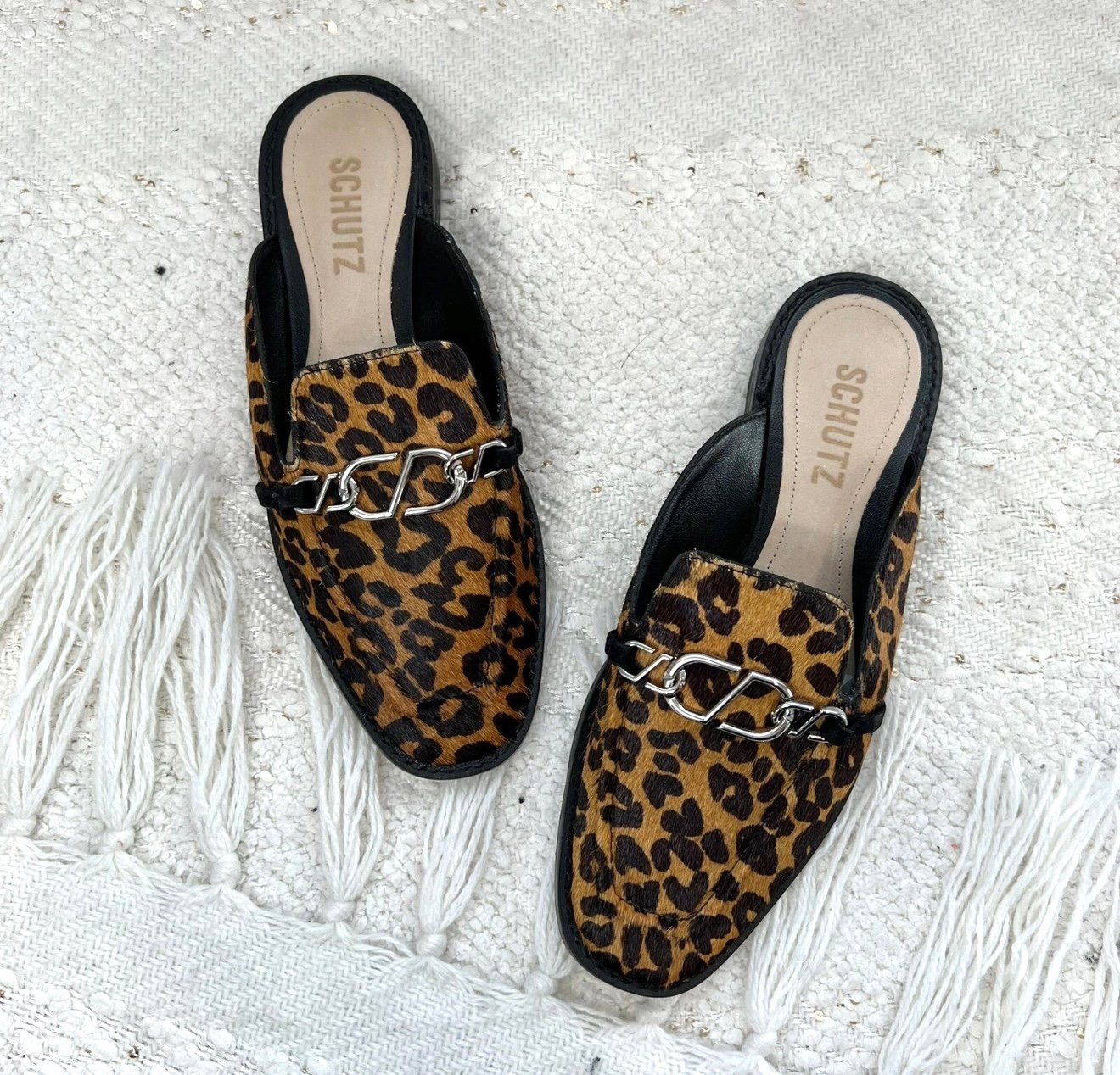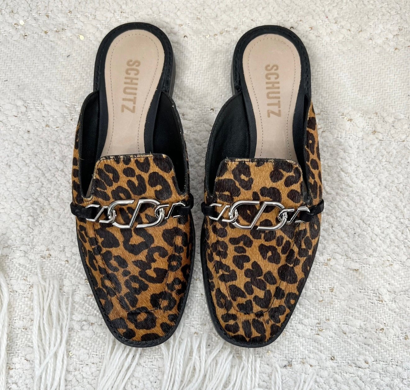 Schutz tan and brown cheetah print calf hair fur slip on mules with silver tone metal accent details.