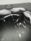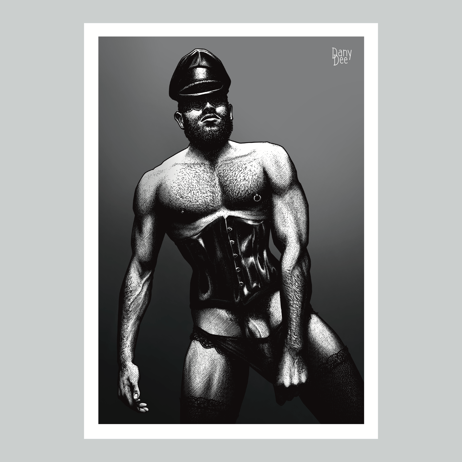 "Lace & Leather" (censored version) is a hand-drawn, monochromatic A4 art print celebrating queer gender-fluid fetish culture — a bold homoerotic illustration of a massive hairy bear in a corset and lace stockings, perfect for gay BDSM art collectors or queer home decor.