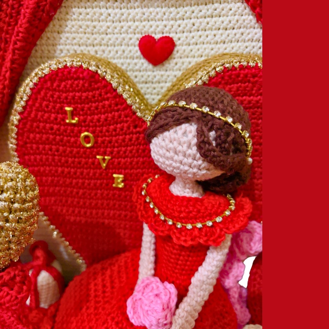 You also need: stuffing, scissors, glue, sewing pins, ruler, 5mm thick cardboard, red felt, tapestry needle, 2 skewers or thin chopsticks, gold colored 10mm letters to spell “LOVE”, 3 felt/fabric hearts of 25mm, 1 cotton swab, mini rhinestones on a wire