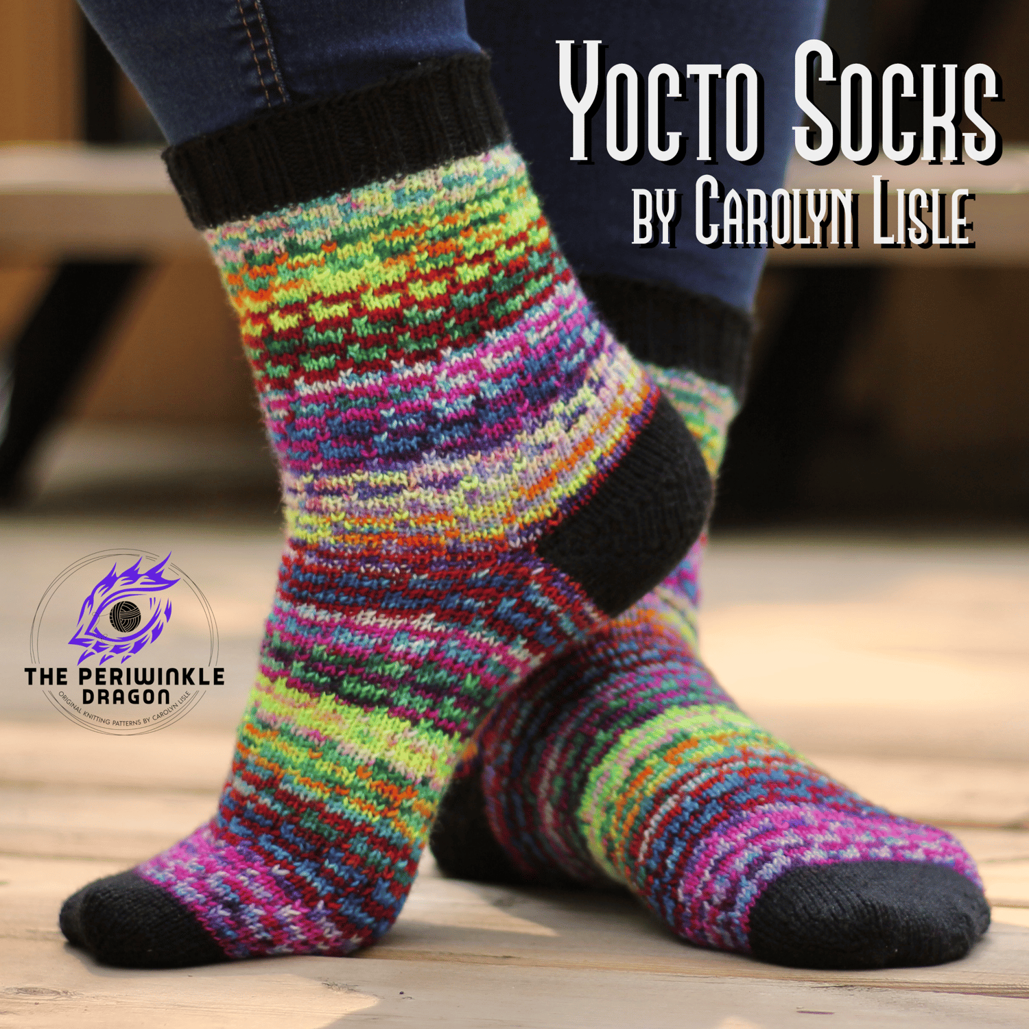 Got leftover sock yarn to use up? How small are those scraps in your scrappy socks bag? I mean, probably not actually “yoctometre” small — as the third-smallest named SI unit in the metric system, one ym is 10^(-24) m (meaning, you would write zero-decimal-23-zeros, then the one), which is so small that around eight hundred fifty million of them make up the width of a proton! — but these socks can definitely help you use up relatively short lengths of yarn that only have a few rounds left in them. With an emergent spiralling effect from a short stitch-pattern repeat, these socks are great for a quick but impressive-looking project!