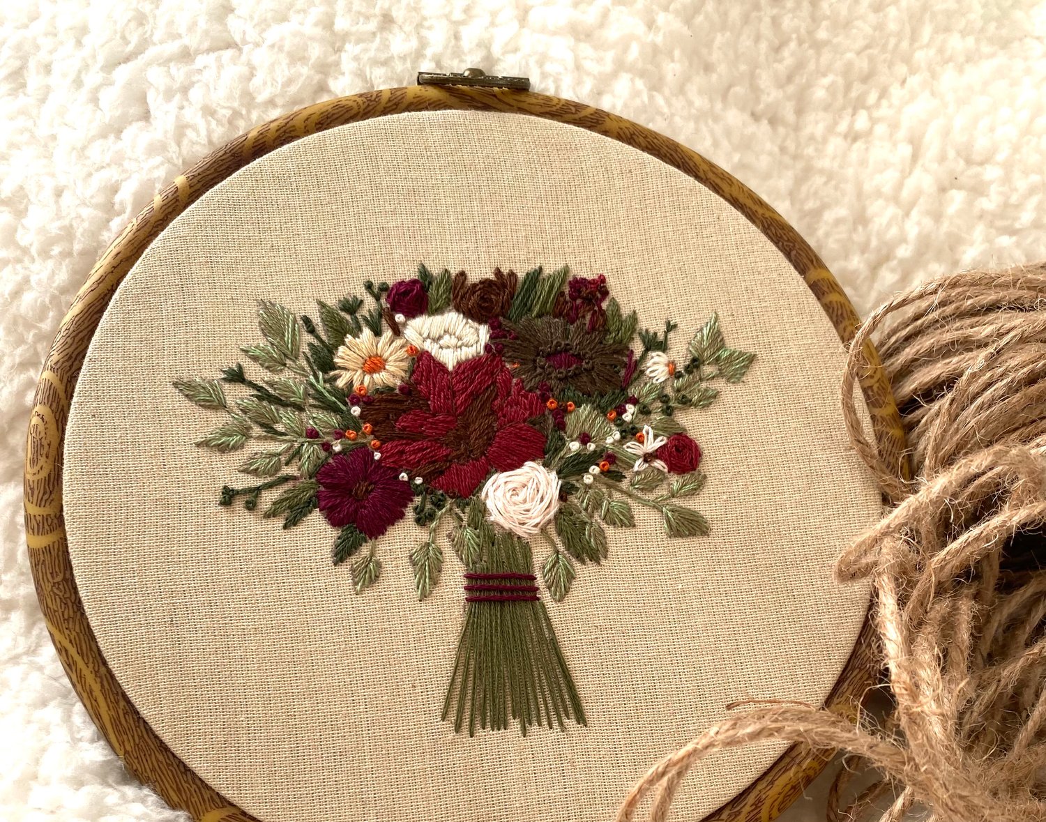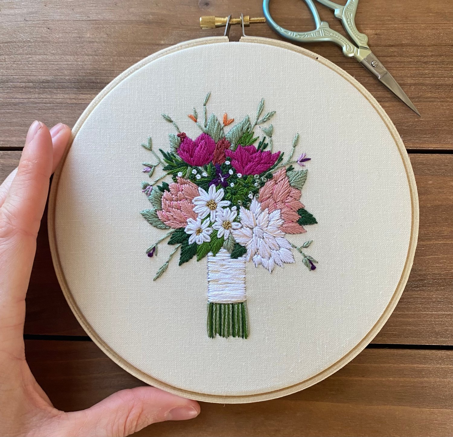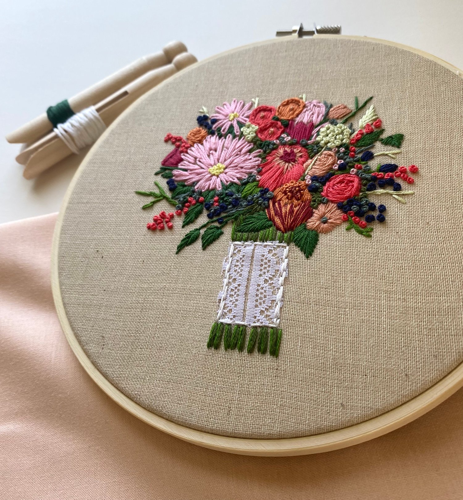 Bouquets are stitched on white or beige linen using a 8” embroidery hoop