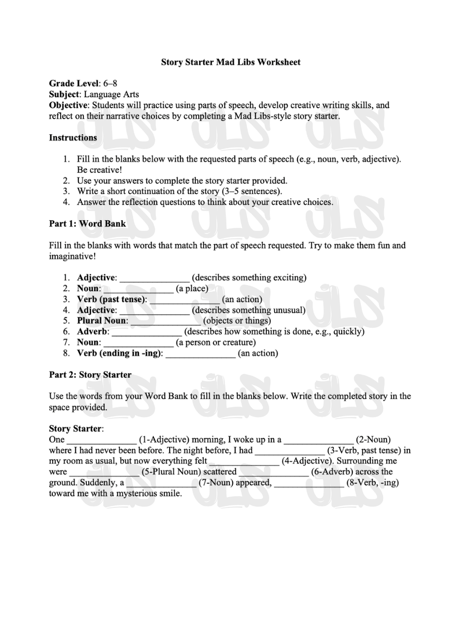 Objective: Students will practice using parts of speech, develop creative writing skills, and reflect on their narrative choices by completing a Mad Libs-style story starter.