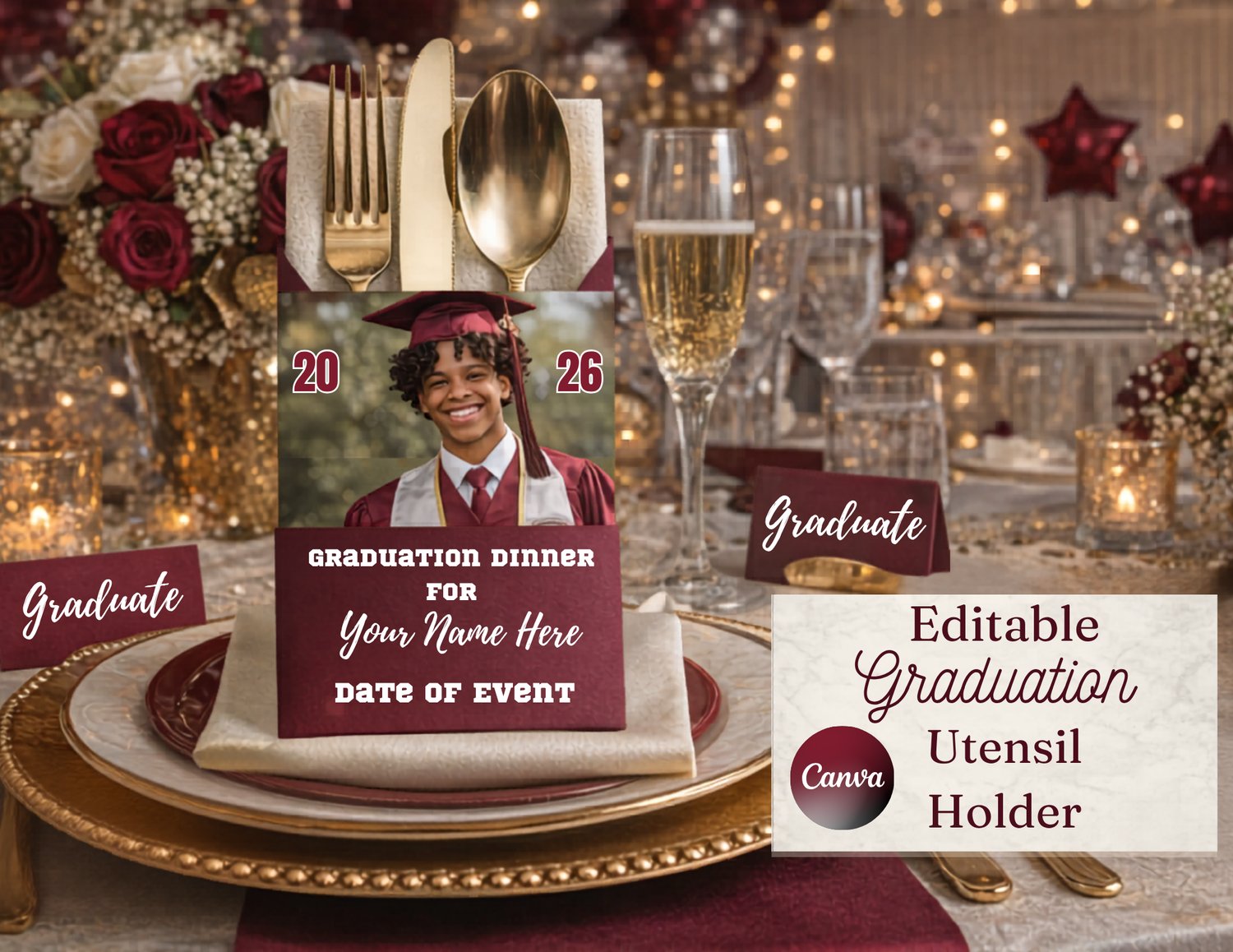 Celebrate your graduate in style with this stunning Editable Graduation Utensil Holder Template. It’s the perfect addition to any graduation dinner or party setup! Designed to elevate your table décor, this elegant holder features a personalized photo layout, bold Class of 2026 details, and school color customization to match your graduate’s theme.