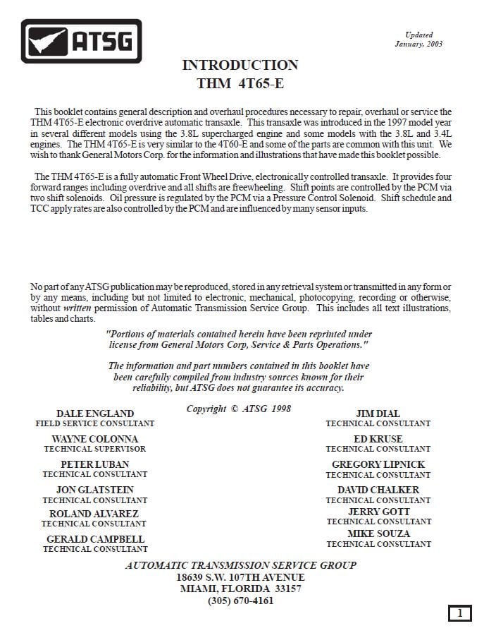Since the introduction of the THM 4T65-E transmission in model year 1997, there have been many major engineering design changes to improve durability and reliability. These changes have affected many of the parts used in the THM 4T65-E. This "Update Handbook" will cover preliminary information and will also explain each change, the parts affected by the change, and any parts interchangeability concerns created by the change. This manual is a companion manual to the 4T65-E Blue assembly and disassembly manual and is most helpful during a rebuild.