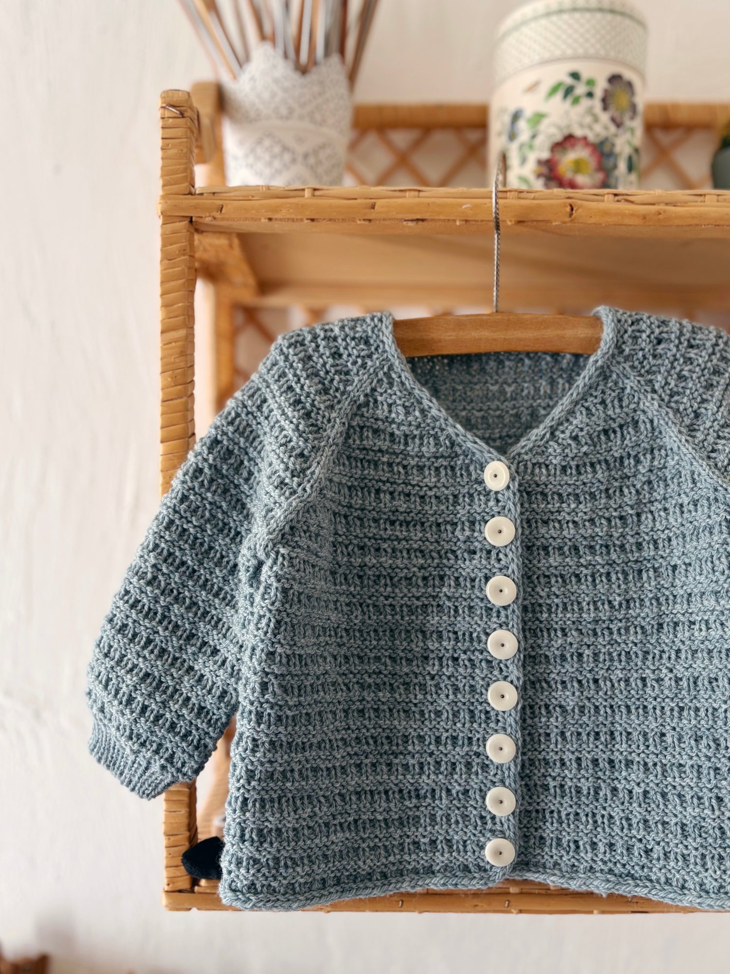 Sa construction simple et classique en fait un projet agréable à réaliser, tandis que le point texturé apporte du relief et rythme joliment les rangs. Les manches raglan offrent une aisance naturelle, idéale pour le confort et la liberté de mouvement des tout-petits.