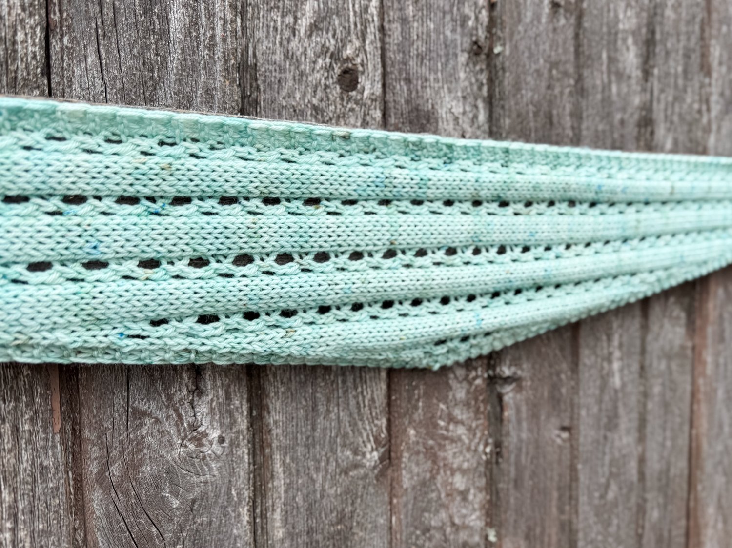 This elongated, asymmetrical scarfette features bands of vine lace separated by simple stockinette, creating a knitting rhythm that’s both engaging and wonderfully relaxing. Gentle increases shape the piece to a shallow center, then taper to narrow ends - giving it that effortlessly stylish, easy-to-wear drape.