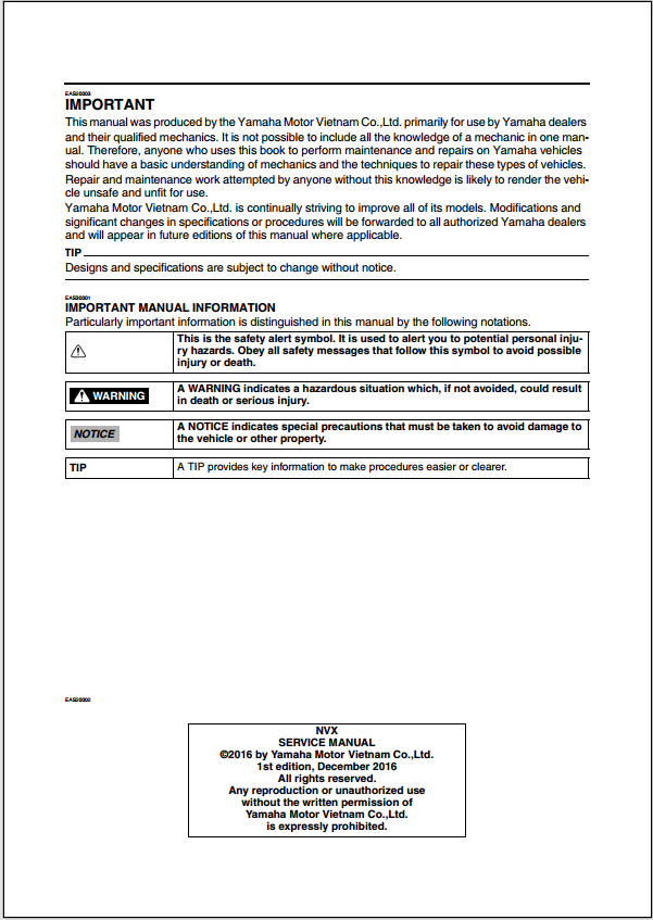 2017 Yamaha GDR155 - GDR155-A NVX Service Manual Part No. B63-F8197-EZ
