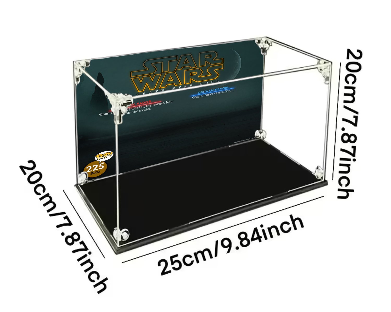 Ce fond a été réalisé spécifiquement pour cette figurine et s’intègre parfaitement dans une vitrine 25x20x20 cm, recréant l’ambiance sombre et cinématographique du duel sur l’Étoile de la Mort.