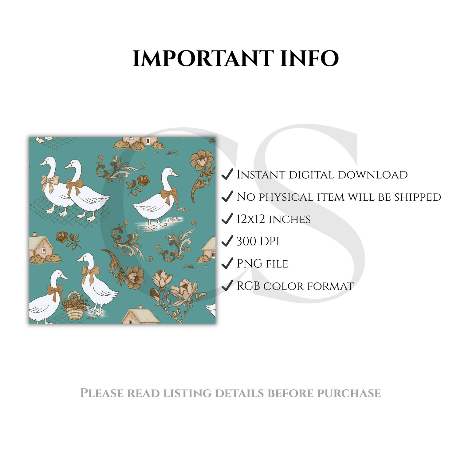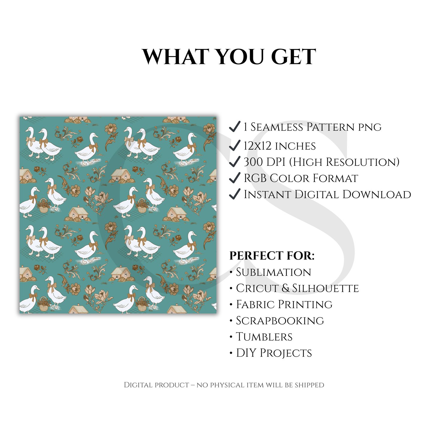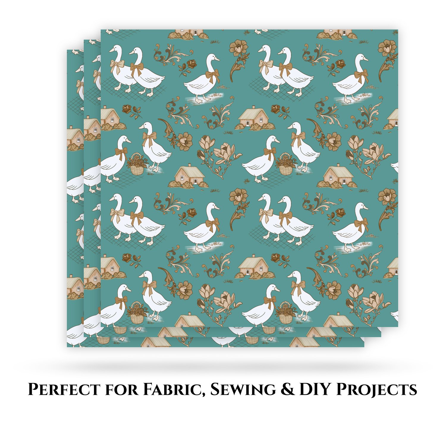 Vintage Goose Seamless Pattern PNG, Farmhouse Duck Design, Neutral Toile Style Pattern, Rustic Floral Digital Paper, 12x12