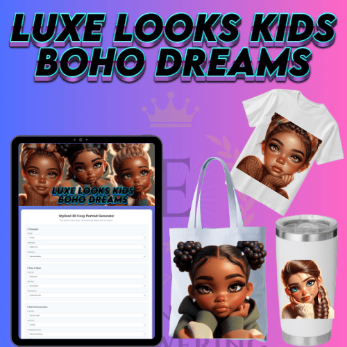 Luxe Looks Kids: Boho Dreams is your all-in-one creative tool for designing dreamy, high-end 3D portraits for characters ranging from toddlers to young adults. Perfect for artists, product designers, and brand builders who want to produce professional visuals fast — whether for merchandise, storytelling, or digital products.
