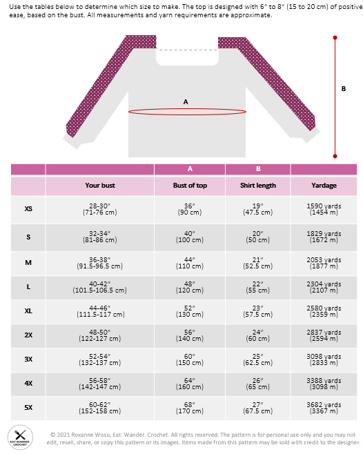 Note: The pattern has been tested, except for the following sizes: 4X. These sizes have been included based on estimated measurements from Crafty Yarn Council standards and tester feedback. If this is your size and you are interested in testing, please message me here or email me eat.wander.crochet@gmail.com