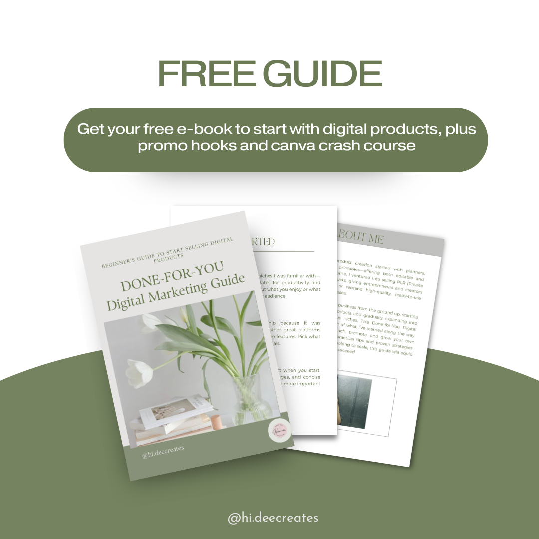Download your free guide and get a bonus Canva Crash Course and Promo Hooks to boost your digital product business!
