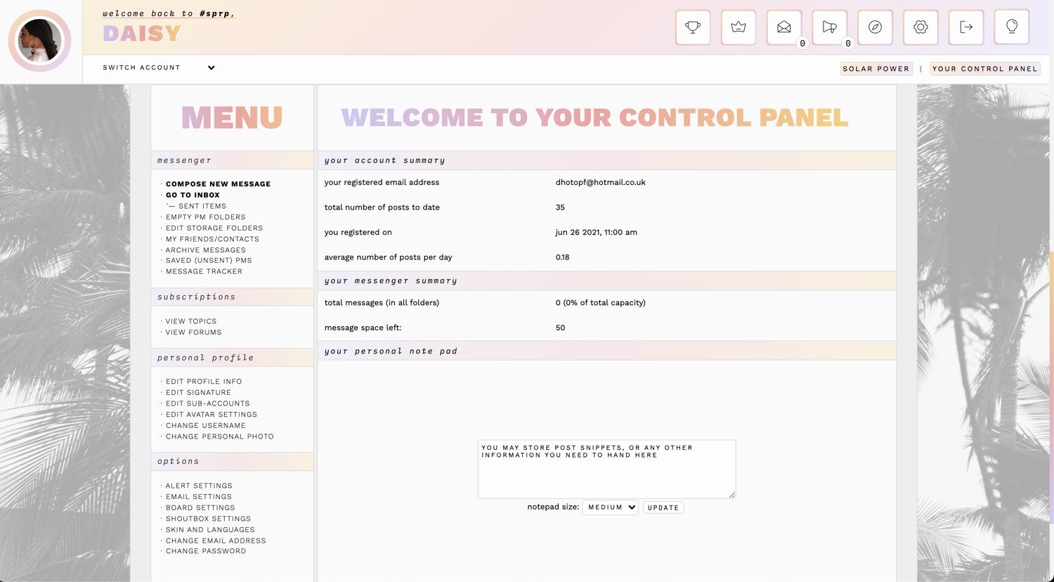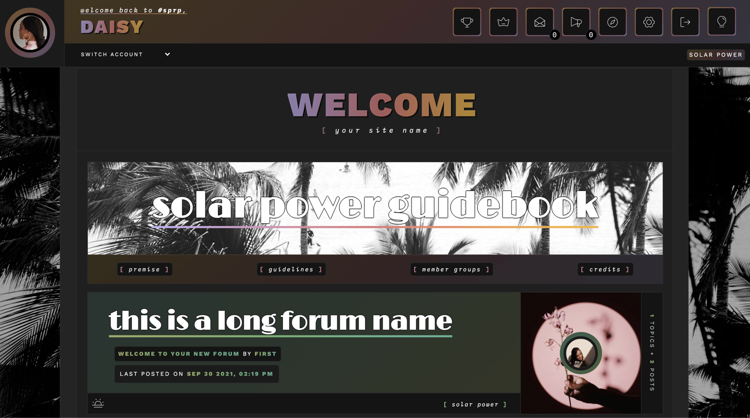 a colourful, easily editable and modern skin for jcink roleplay sites.