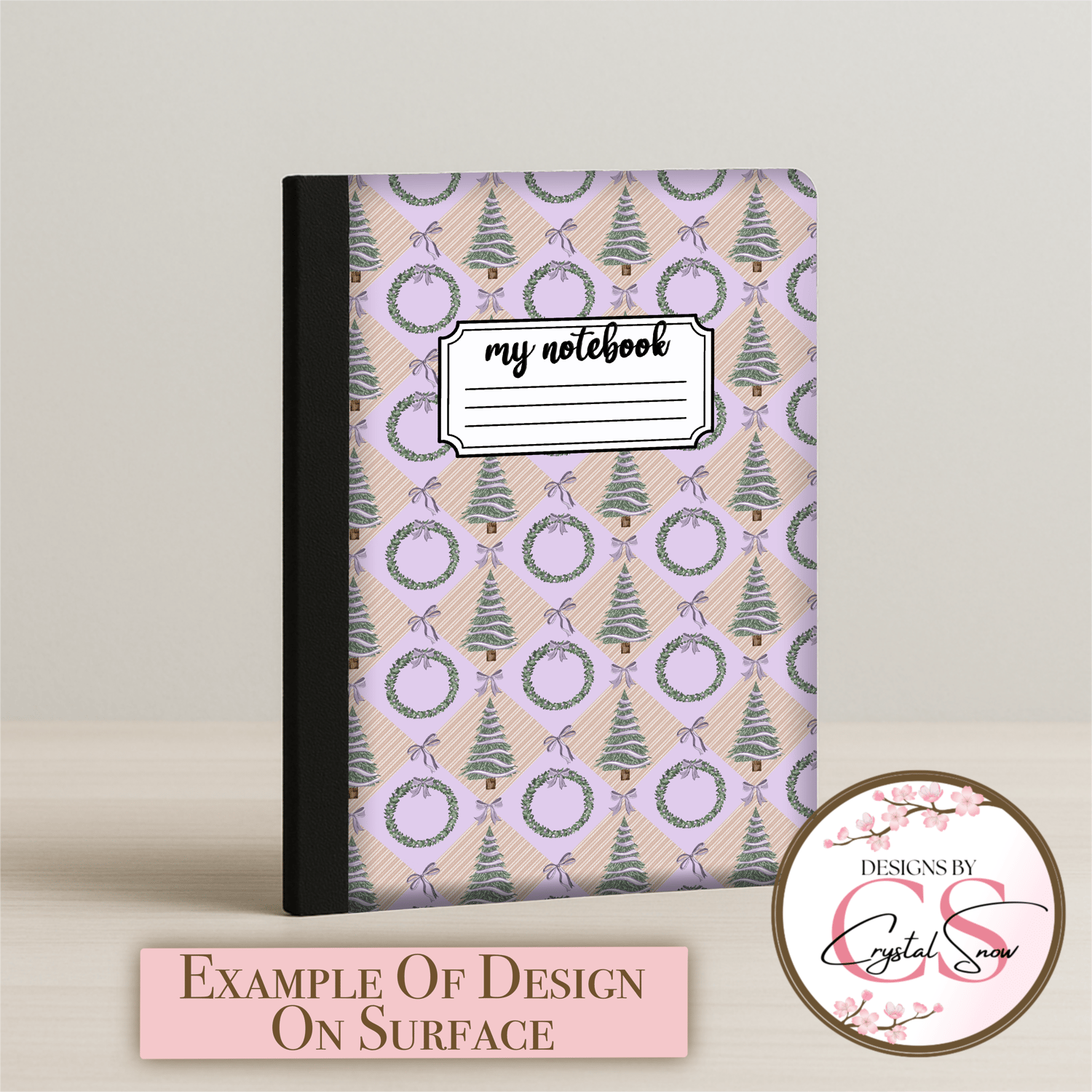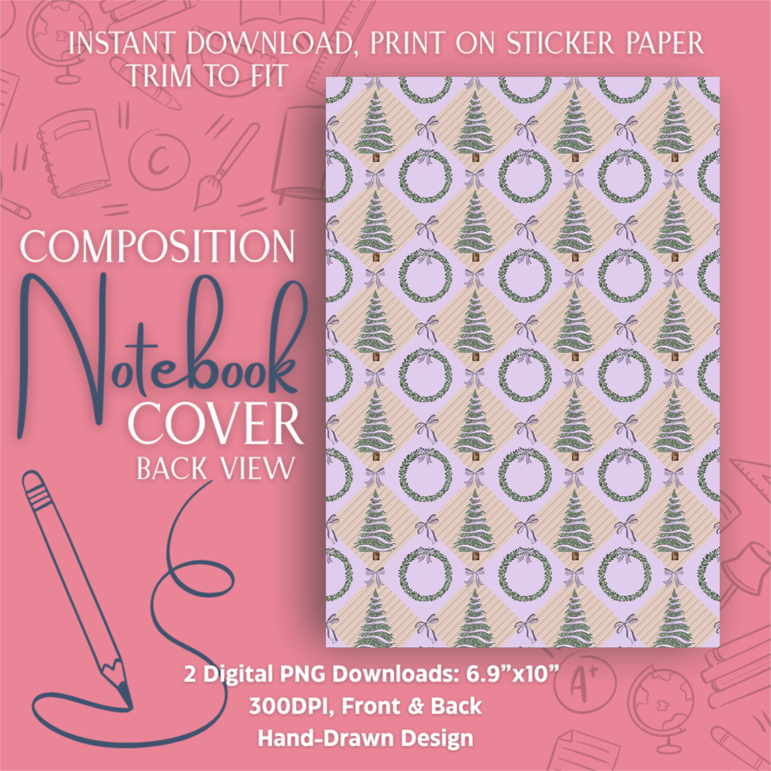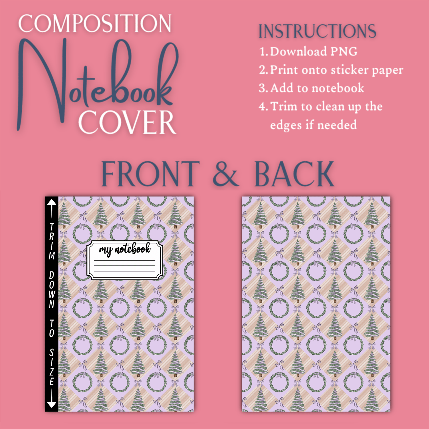 Lilac Evergreen Notebook Cover | Printable Christmas Tree & Wreath PNG | Pastel Holiday Composition Book Cover | Front & Back 8.5x11