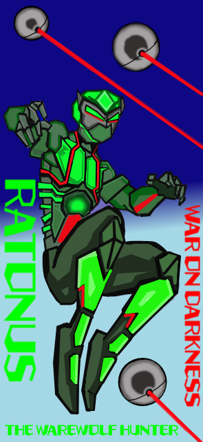 RATONUS HAVE A LL THE K9 SENSES DUE TO HIS MOTHER BEING BIT BY A STRAY DOG YEARS AGO WHILE PREGNANT. ALL ALONG, THE STAY DOG HAPPENS TO BE A WAREWOLF. AS SOON AS HE WITHNESS A WOMAN'S DEATH BY A WAREWOLF ATTACK. HE THEN VOWED TO HUNT AND KILL THEM ALL. WITH THE HELP OF A VERY SMART TEENAGER THAT DESIGNED HIS TECH SUIT TO HELP KEEP HIM ALIVE. RATONUS JOINS THE WOD TO HELP MAKE THE WORLD SAFE AGAIN,