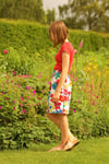 This pattern is sized for woven fabrics such as cotton, silk, satin, wool, linen, rayon, crepe, brocade, gabardine or poplin. If you would like to use knit fabric, please make a knee length muslin first to assess the fit.