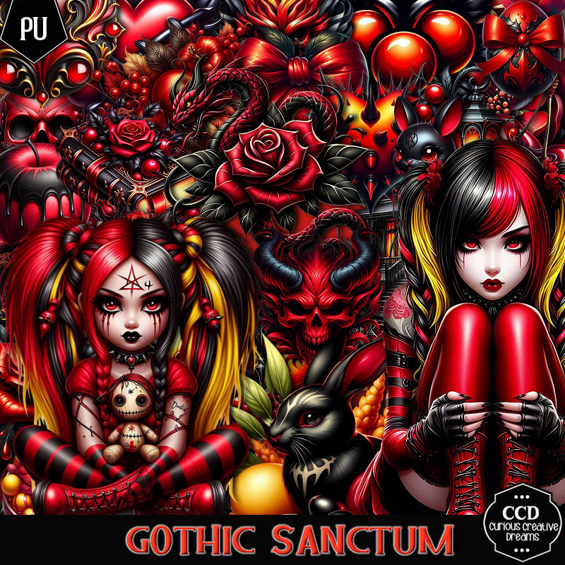 Gothic Sanctum comes with 100 Elements , 16 papers , 6 Frames , 2 AI Tubes By Curious Creative Dreams , AI Generated Kit - Taggers Size , Personal Use ONLY