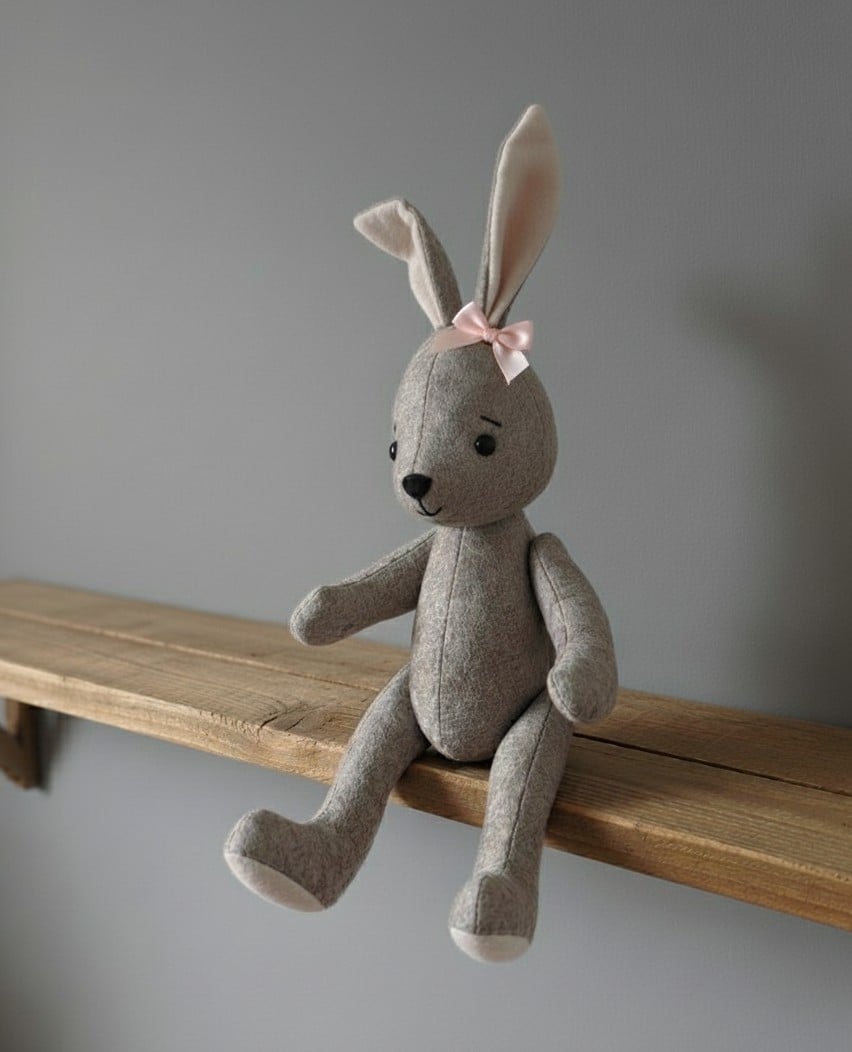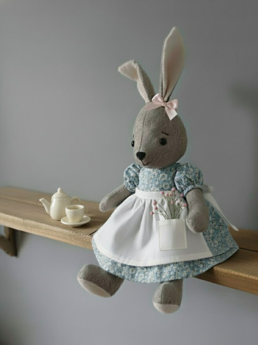 Melanie is a beautiful rabbit she is 16 inch to the top of her ears, her dress and apron are included, there are plenty photos in the easy to follow instructions, she is made here in a wool mix felt but can be made in any fabric even as a memory rabbit.