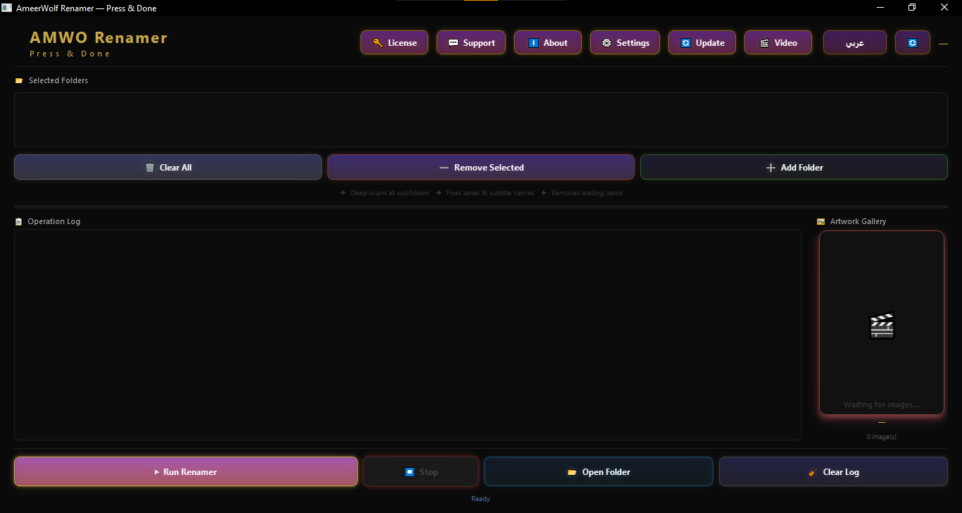 AMWO Renamer Pro+ v3.0.0 هو أداة احترافية لإعادة تسمية ملفات المسلسلات والترجمات تلقائياً. أسماء غريبة وأرقام متشعثة؟ اختر المجلد واضغط تشغيل — البرنامج يتعرف على أي نمط ويحوّله لاسم نظيف ومنظم في ثوانٍ.