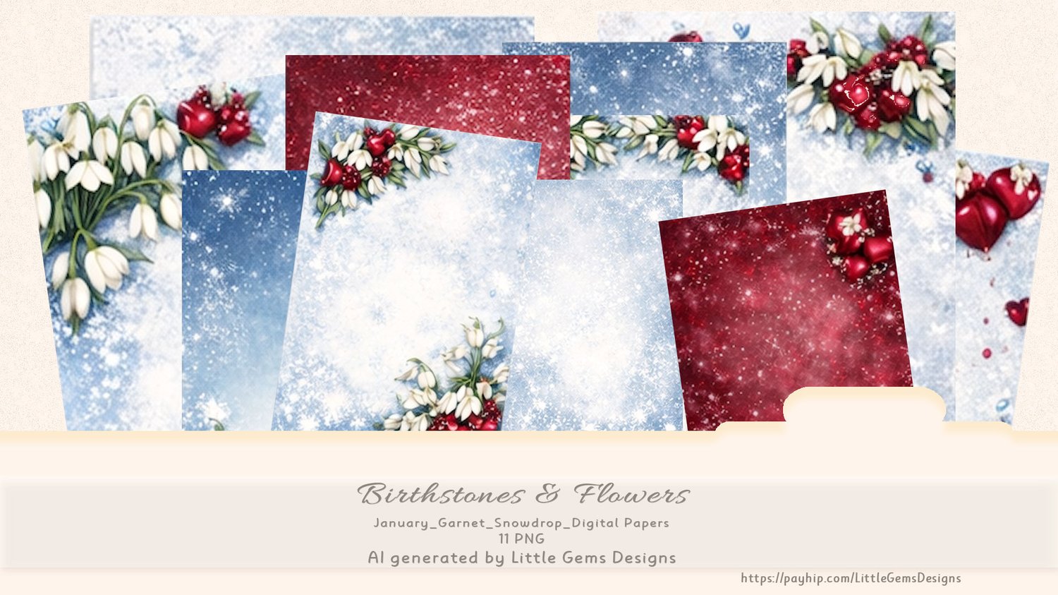 This digital paper pack is part of the Birthstones & Flowers collection and is inspired by the January birthstone Garnet and the delicate Snowdrop flower.