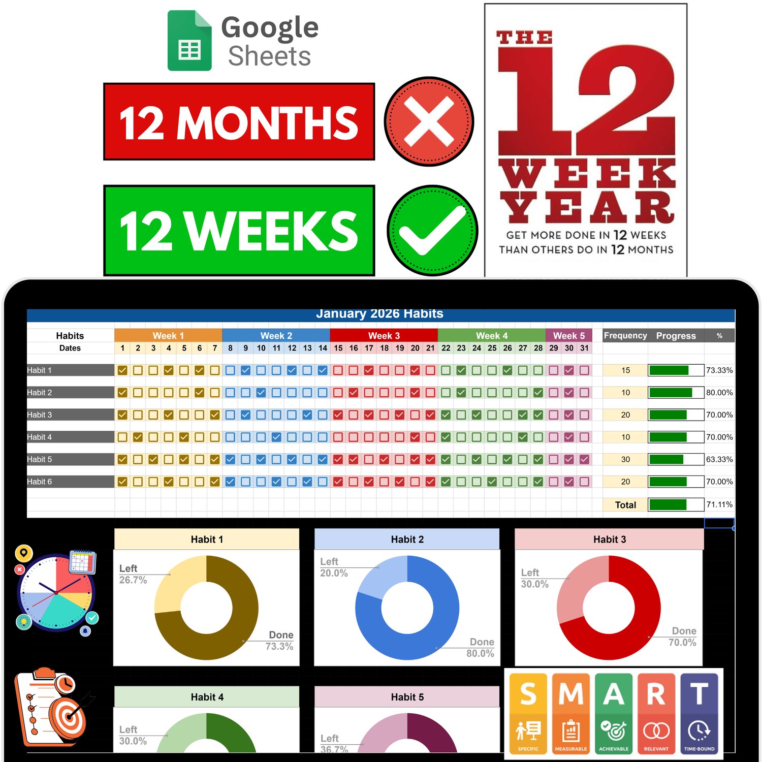 Transform your annual goals into clear, actionable steps with 12 Week Year Google Sheets Planner & Habit Tracker.
