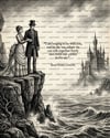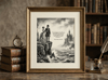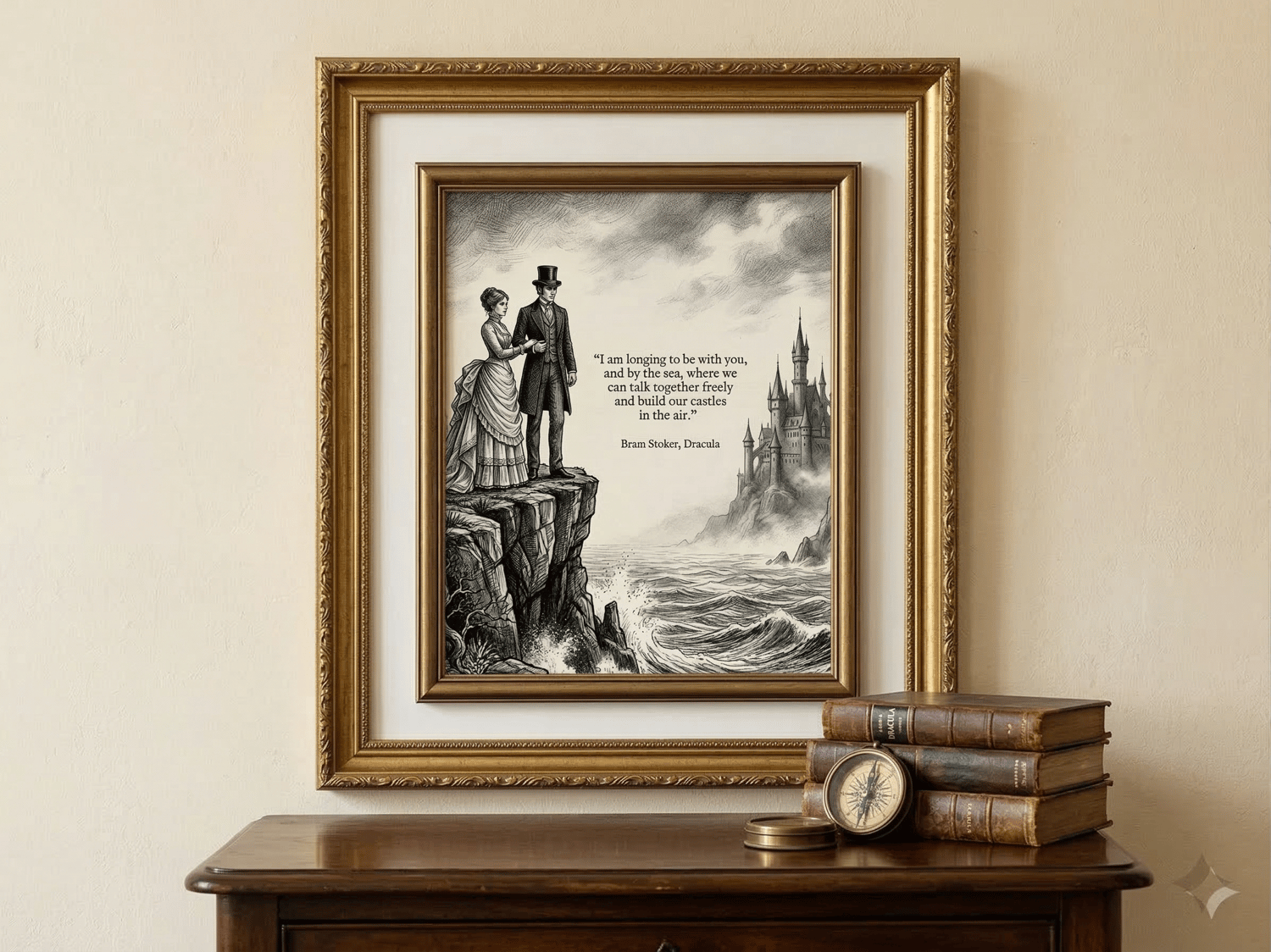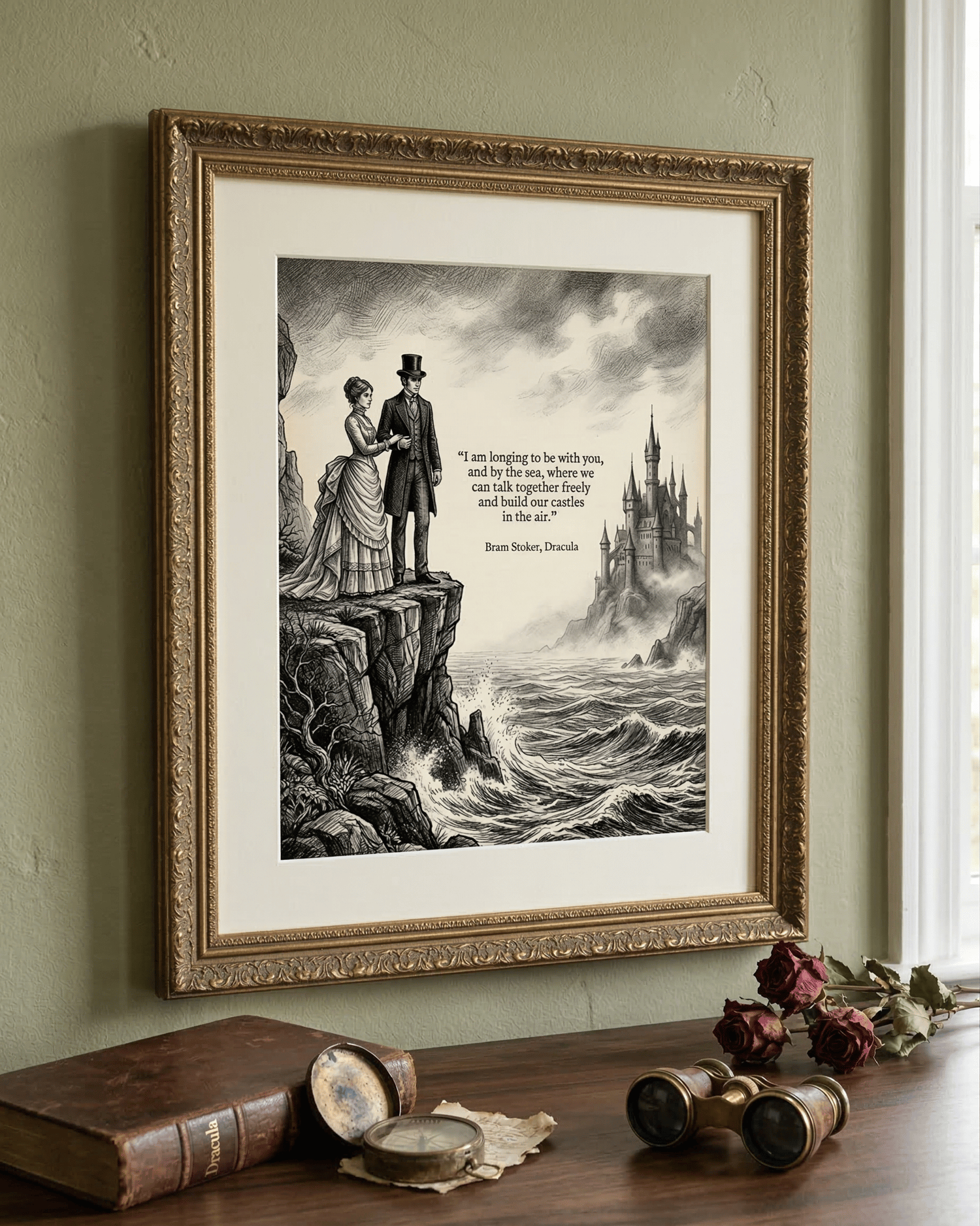 Bring the haunting romance of Whitby and the Victorian moors into your home. This digital print features an intricate, hand-etched style illustration inspired by Bram Stoker’s Dracula. Depicting a Victorian couple on a rugged cliffside overlooking a turbulent sea and a distant gothic castle, this piece perfectly captures the longing of Stoker’s prose.