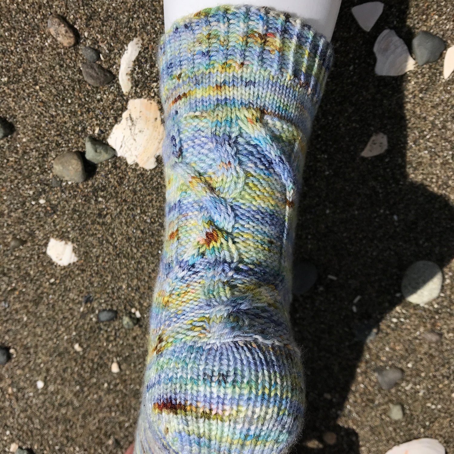 This pattern is inspired by Brackett’s Landing which is a beach area in Edmonds, Washington. I snapped some pictures on one visit and was inspired by the driftwood and ocean waves. The back of the sock has a cable panel that reminds me of the driftwood. The front of the socks is ocean waves.
